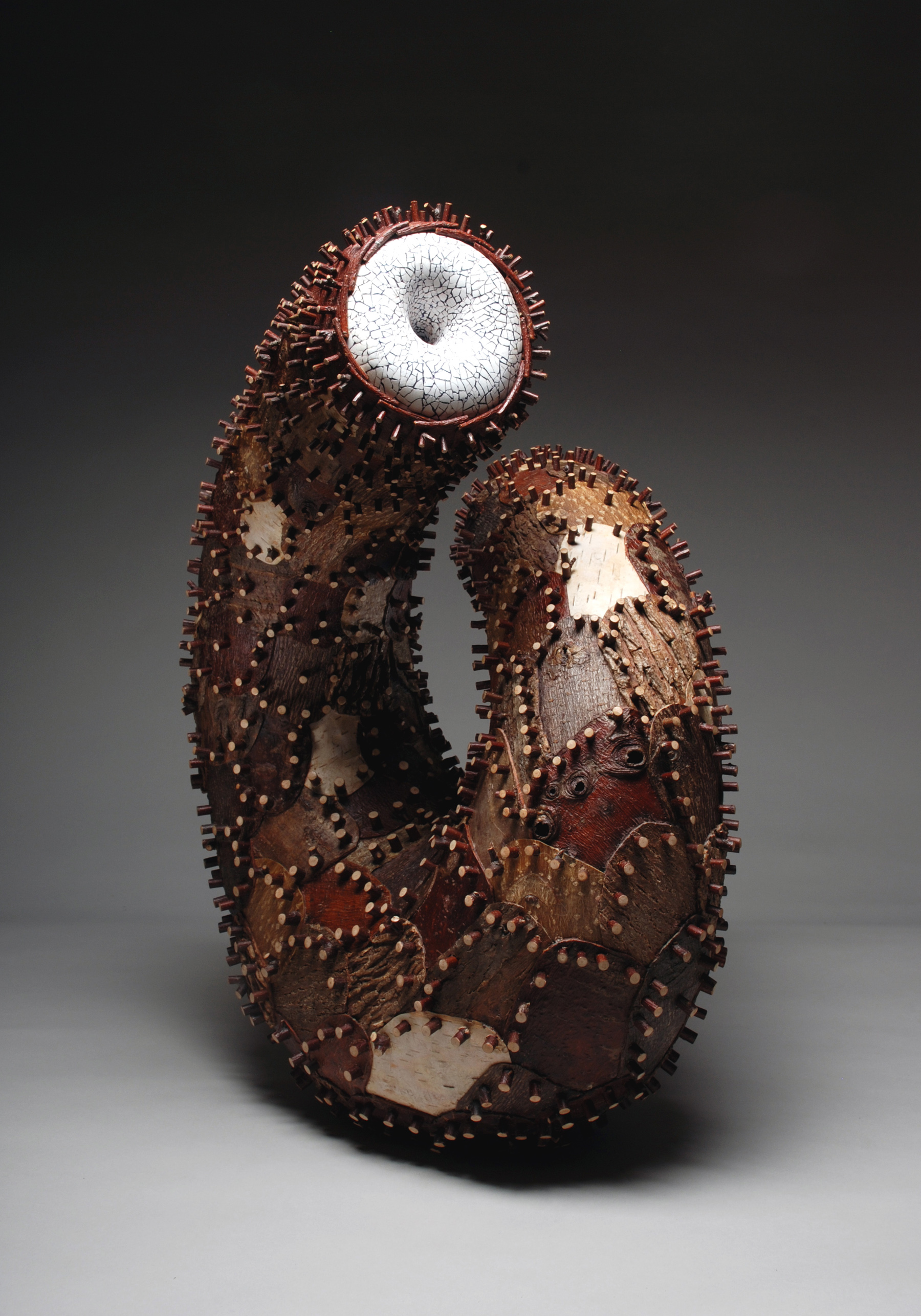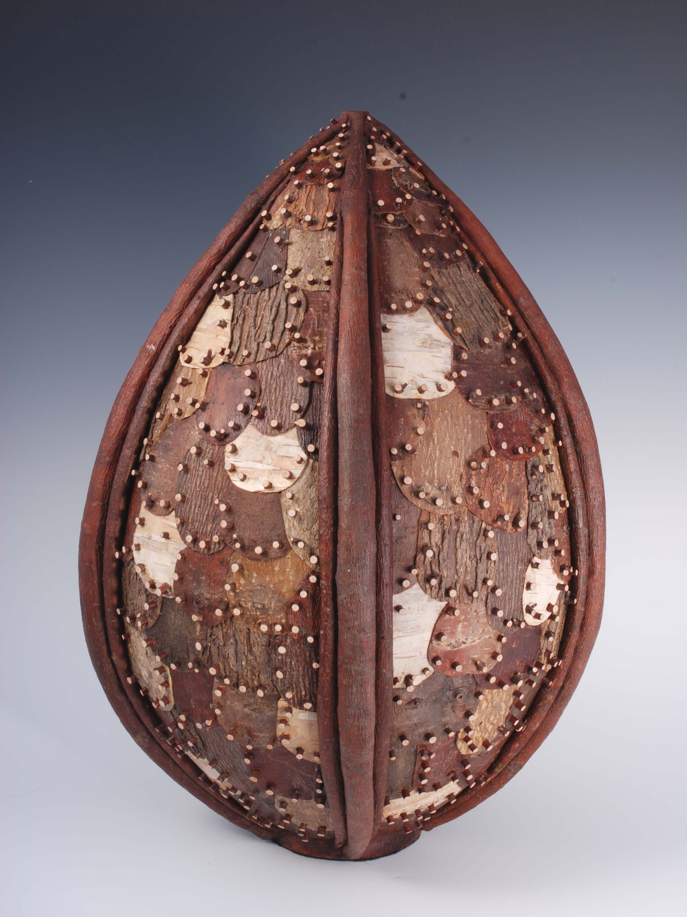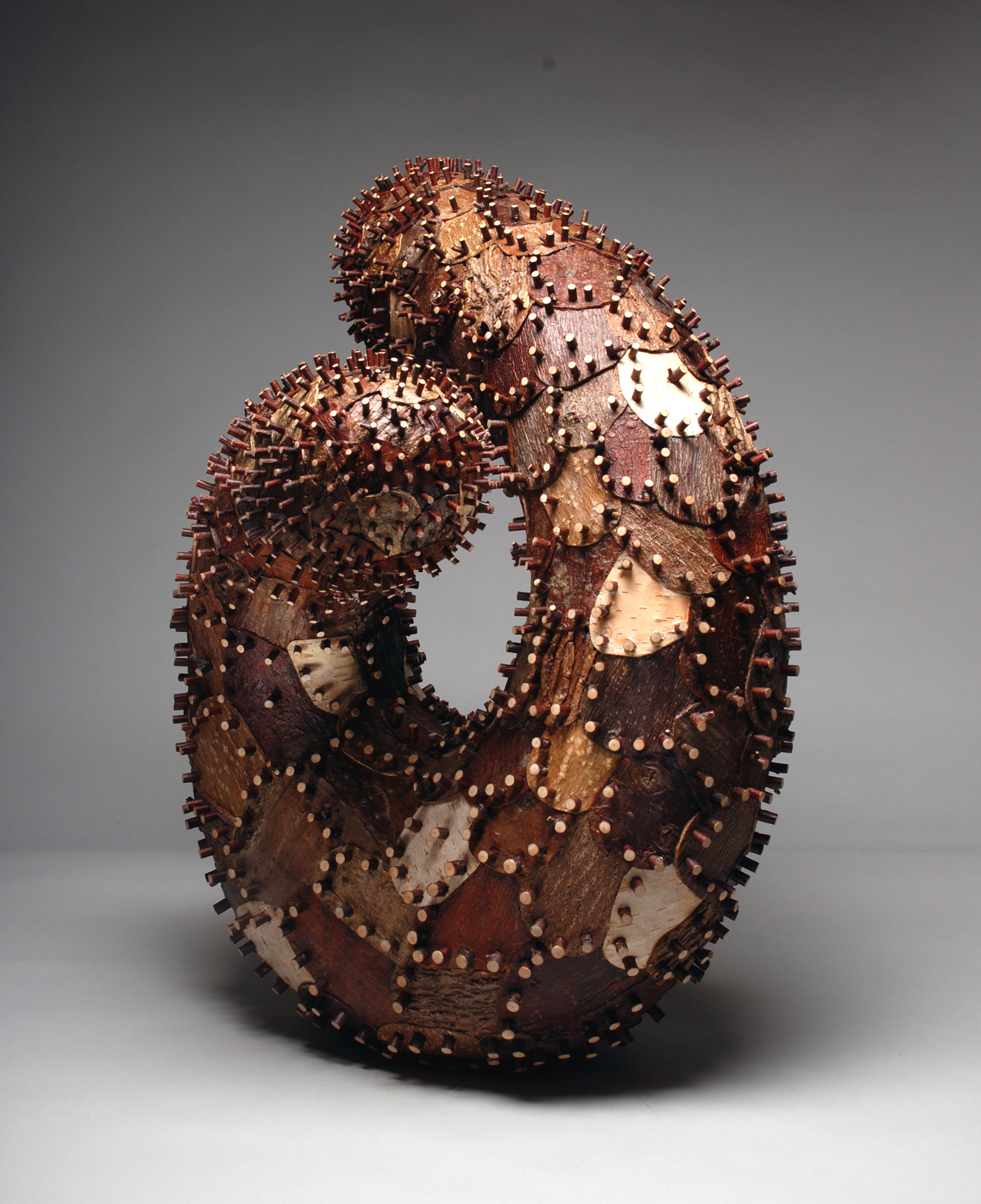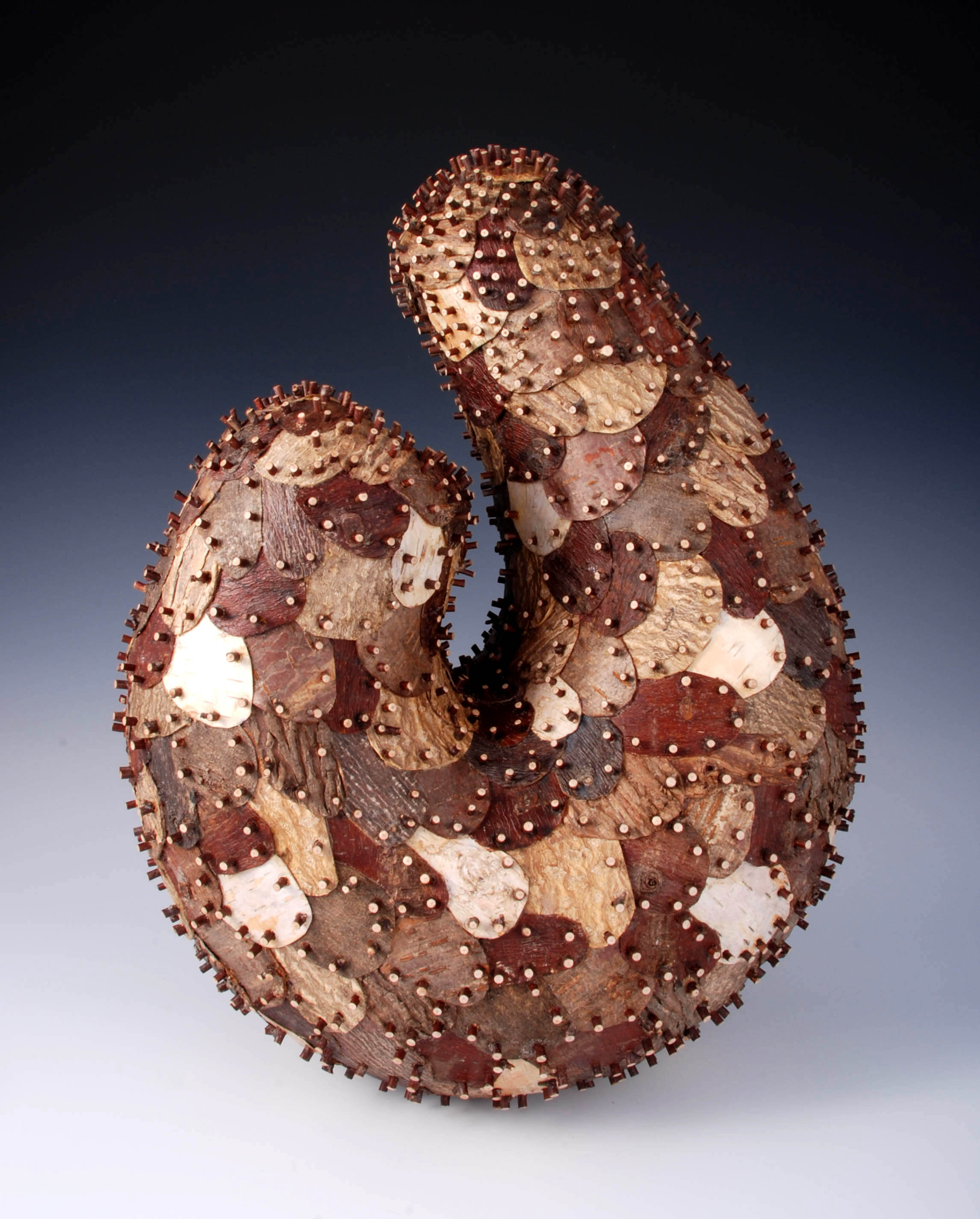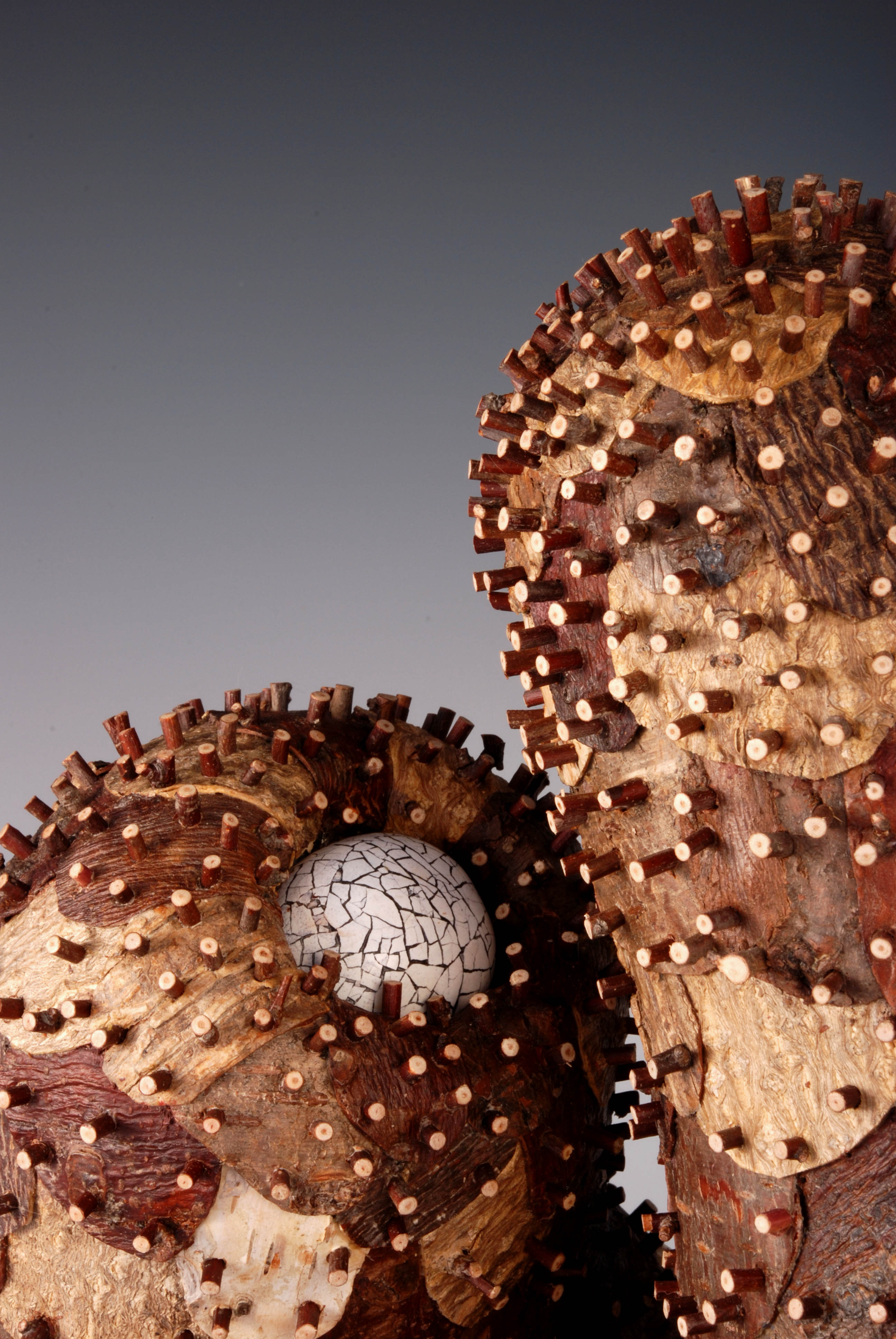 “Roid 2014” various barks, hazelnut and sweet birch pegs, eggshells, 19"h x 14"w x 9.5"d