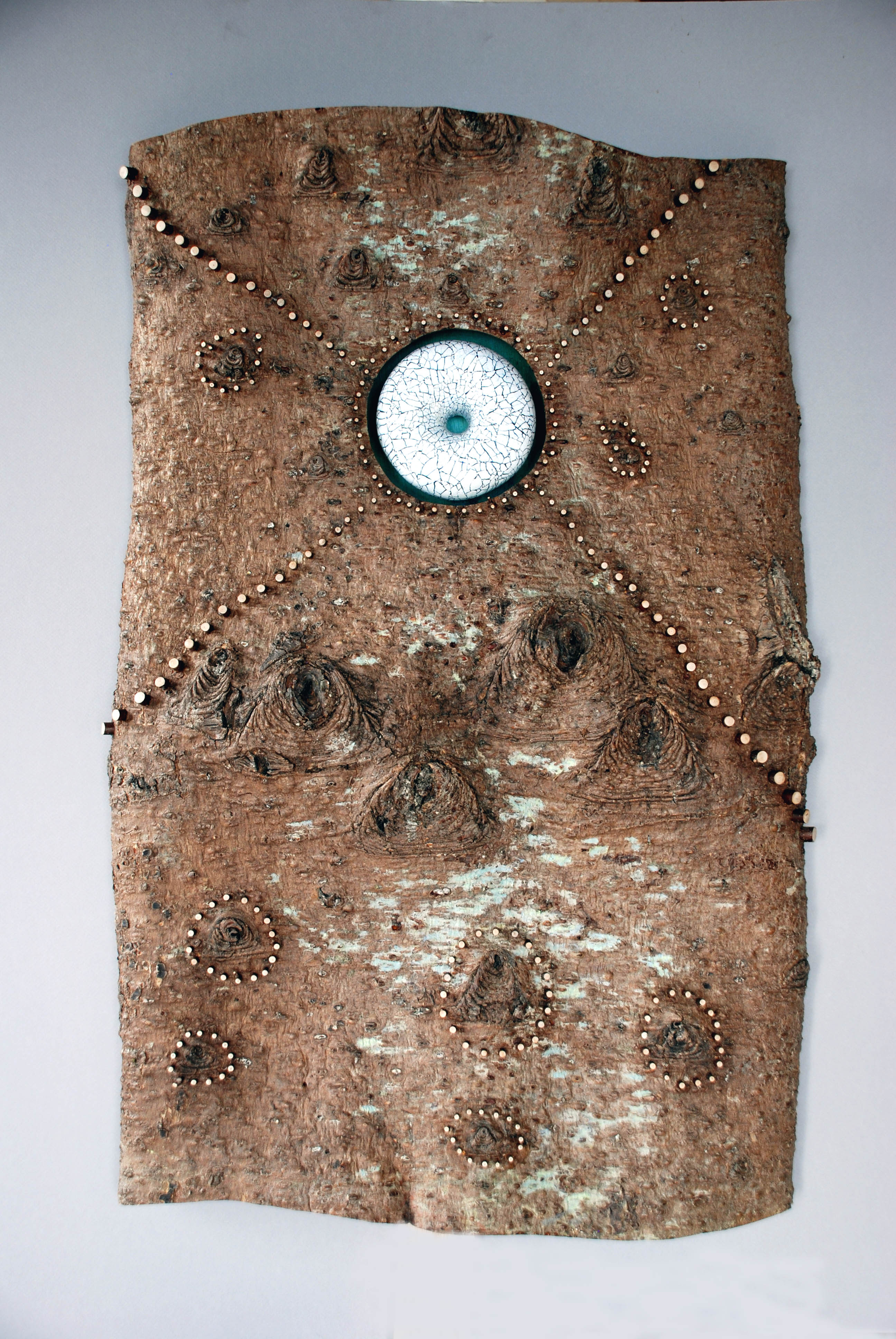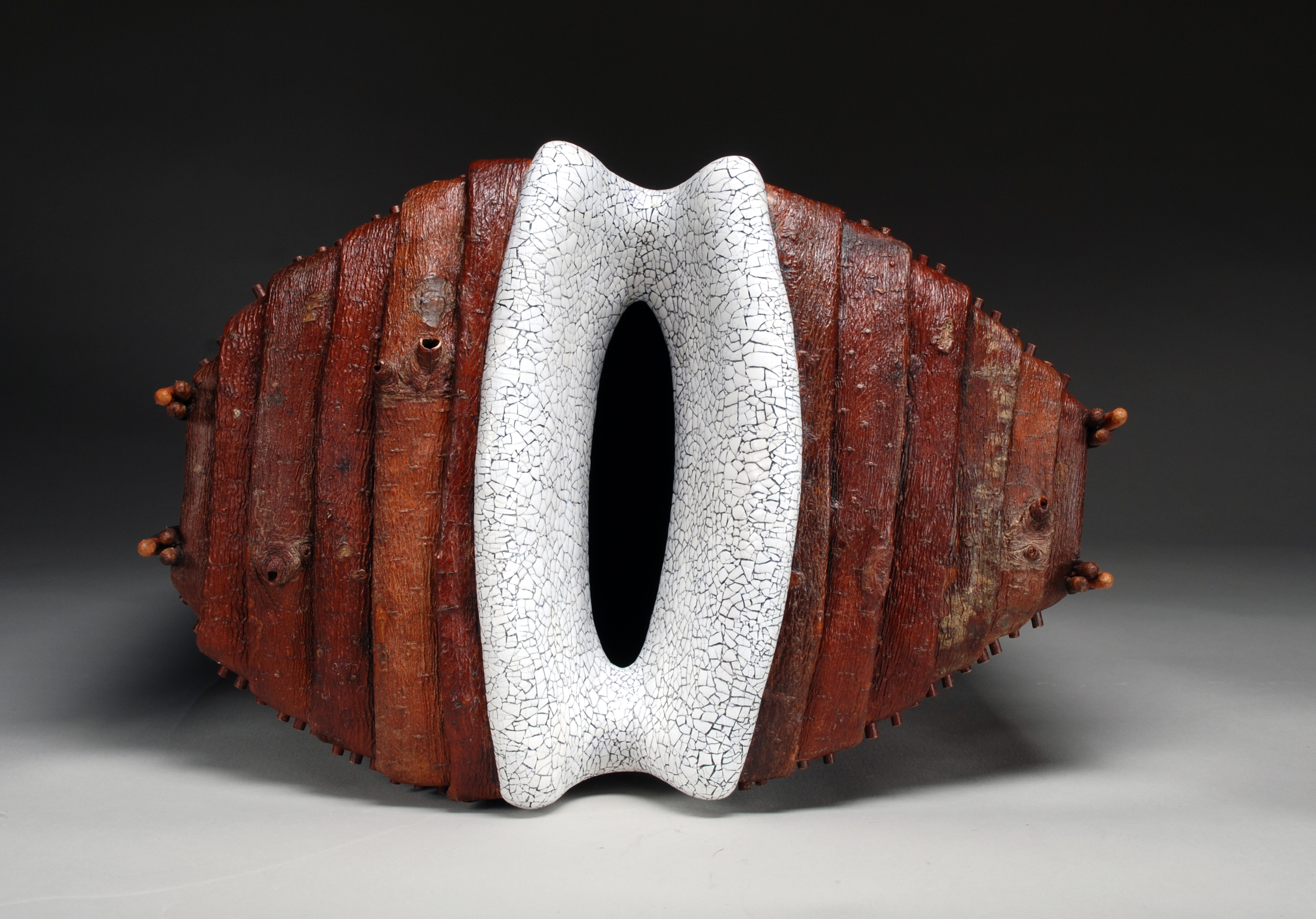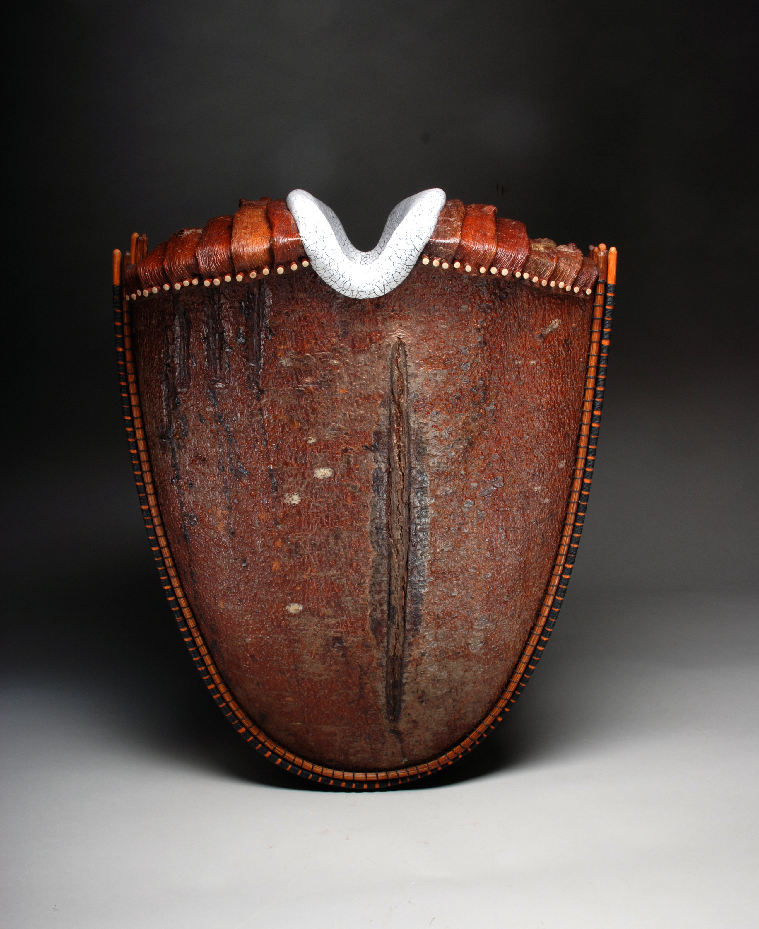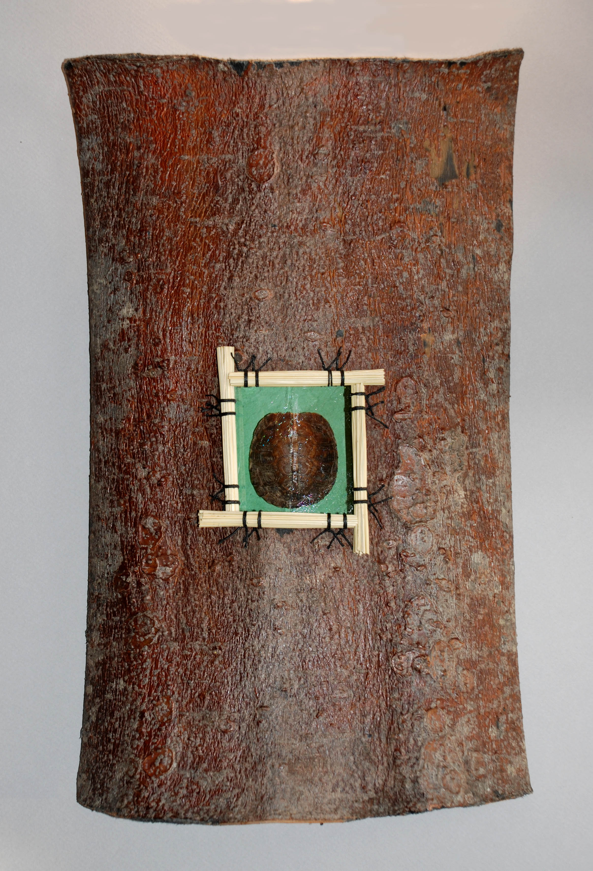 “Roid 2014” various barks, hazelnut and sweet birch pegs, eggshells, 19"h x 14"w x 9.5"d