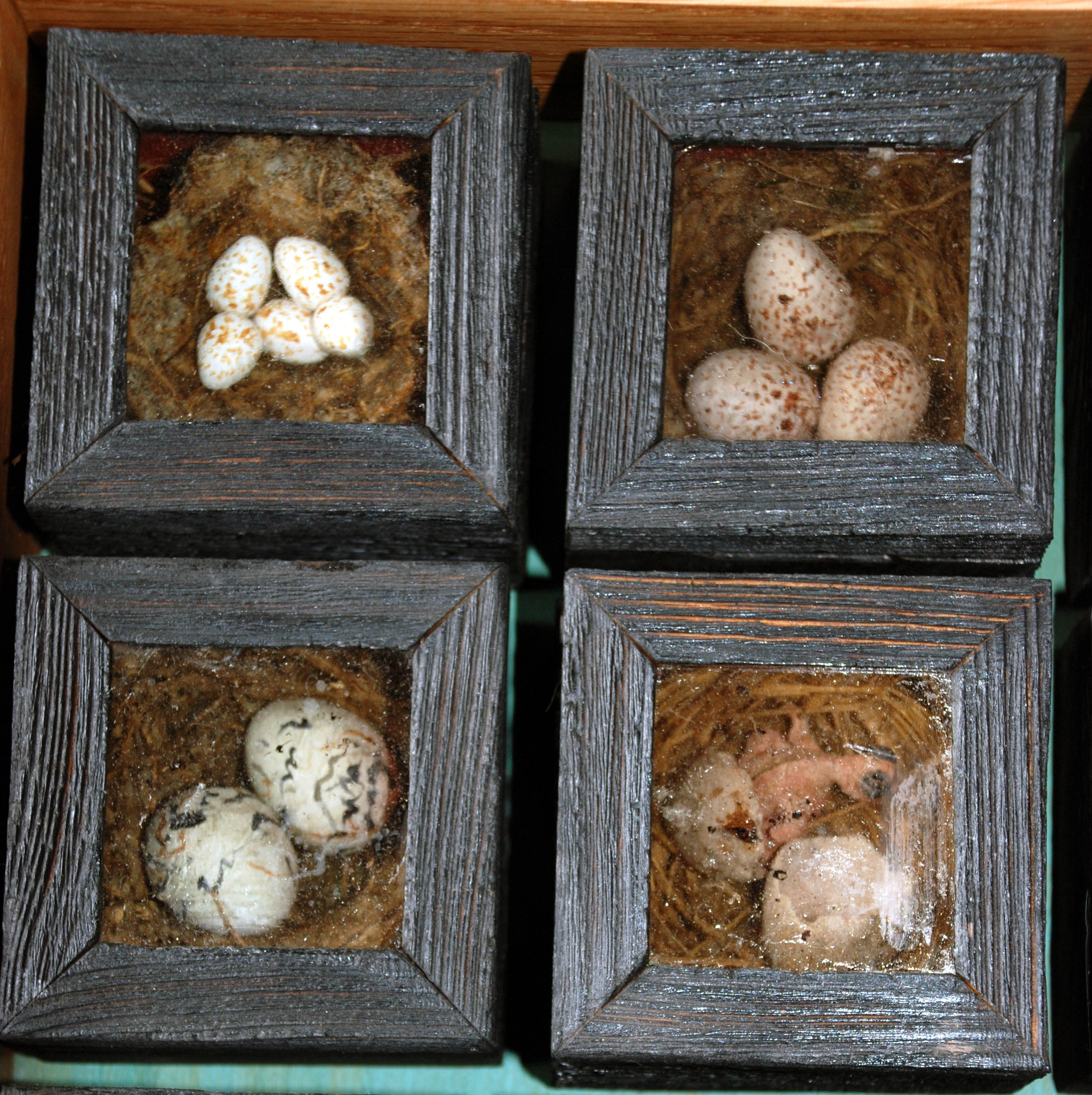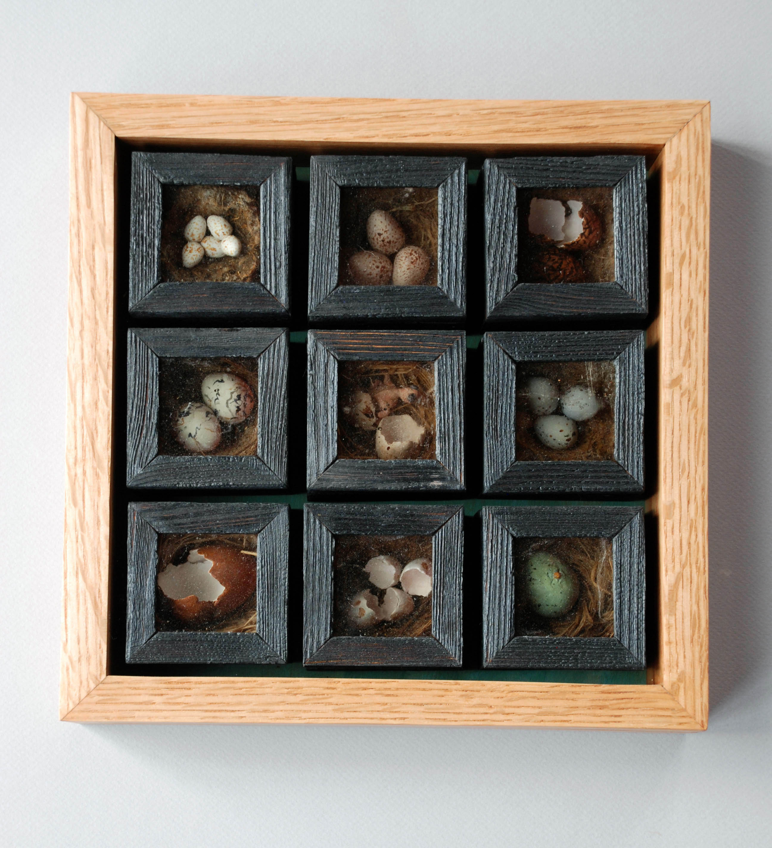 “Reliquary for Nine Bird Species” found wood boxes (burned) clay, fiber 10.5" sq. x 2.25"d
