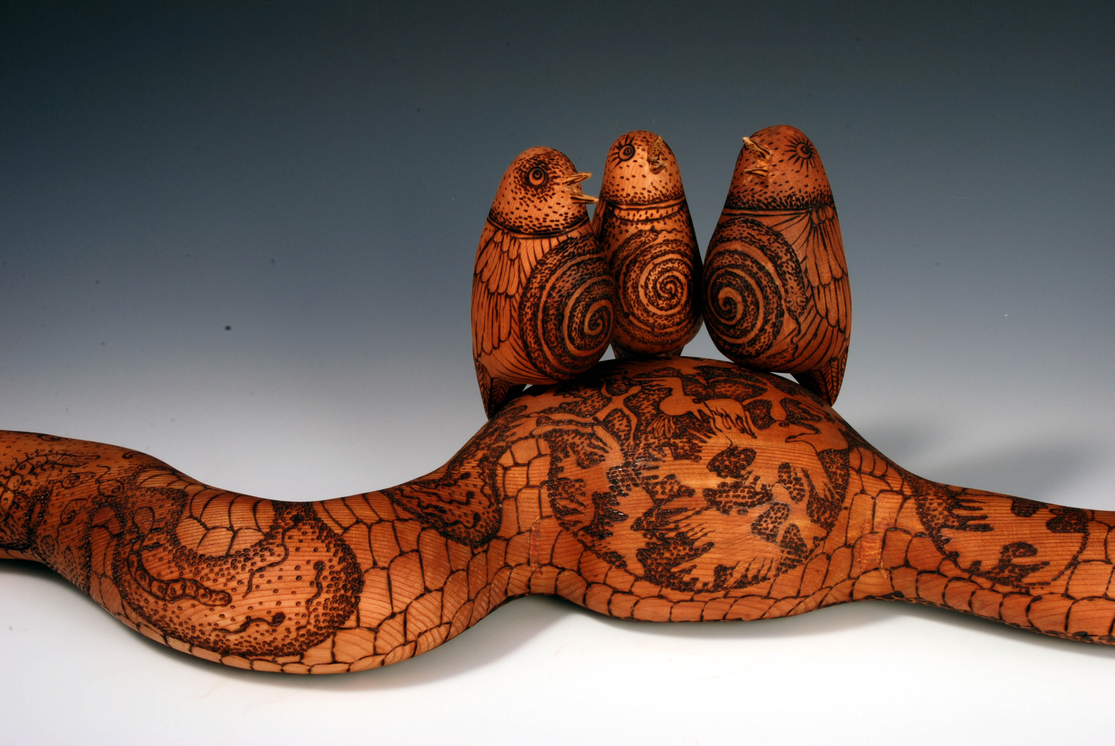 “Symbionts” cedar, sweet birch, woodburned 36"l x 7"h x 8"d
