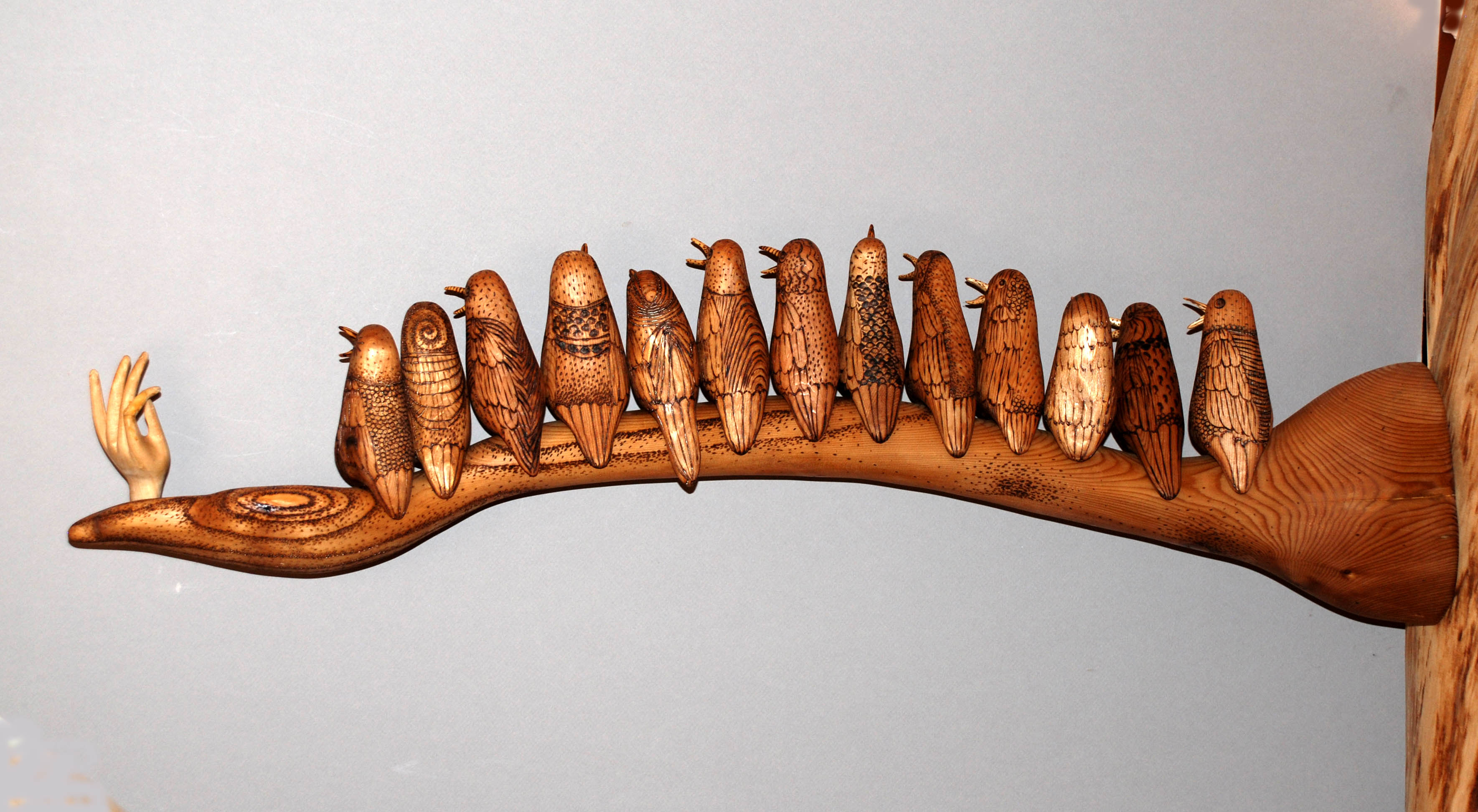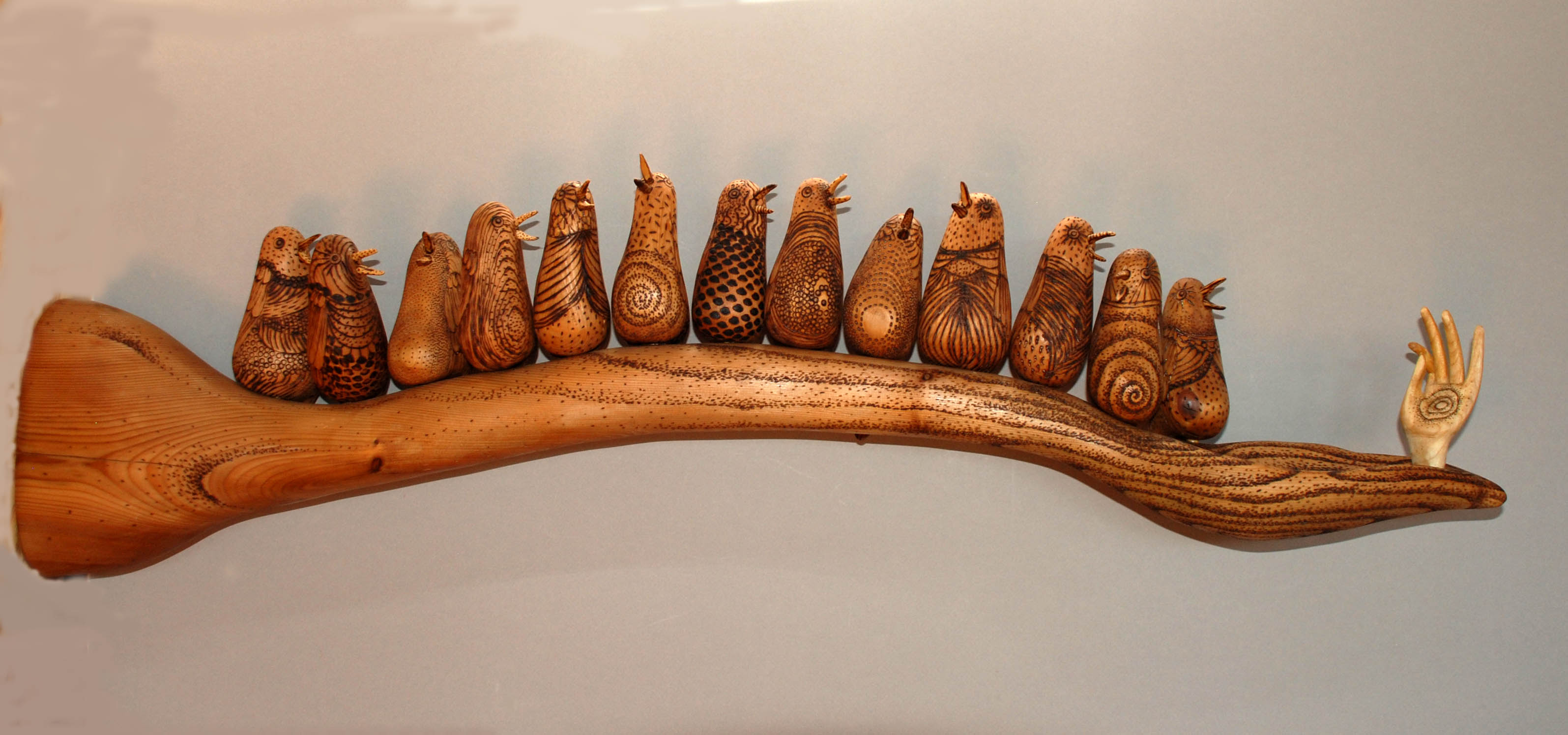 “Murmurations-Fortisimo” cedar, woodburned 32"l x 10"h x 4"d