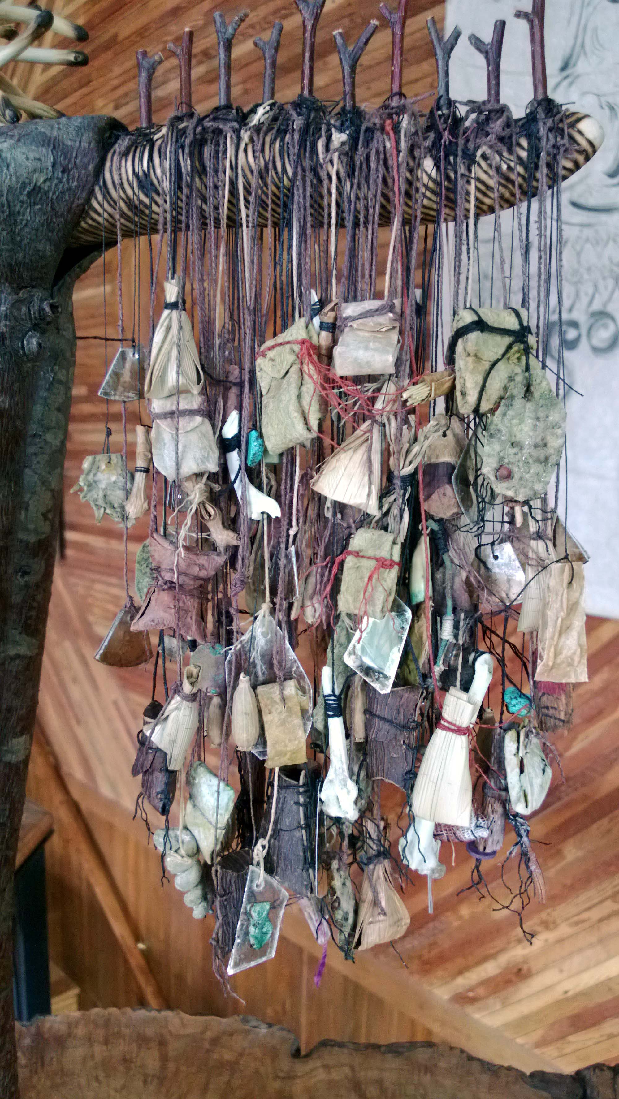 “Onath” white pine bark, cedar, honeysuckle, curly willow, and many packets made of bark, hand made paper, mica, feathers, bones, turquioise, you get the picture
