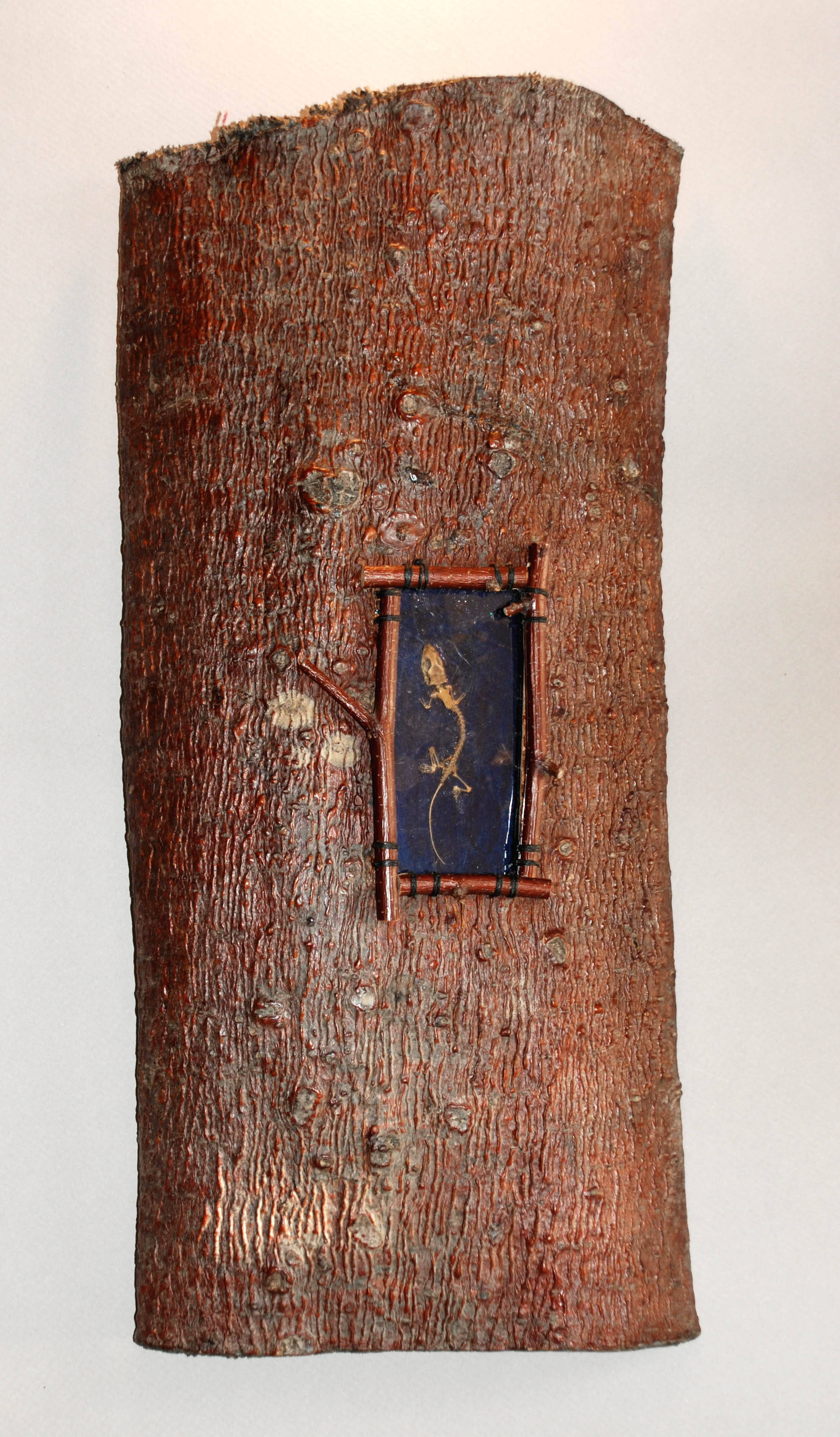 “Gecko Reliquary” white pine bark, gecko skeleton, sweet birch, waxed linen 15.5"h x 7"w x 2.5"d