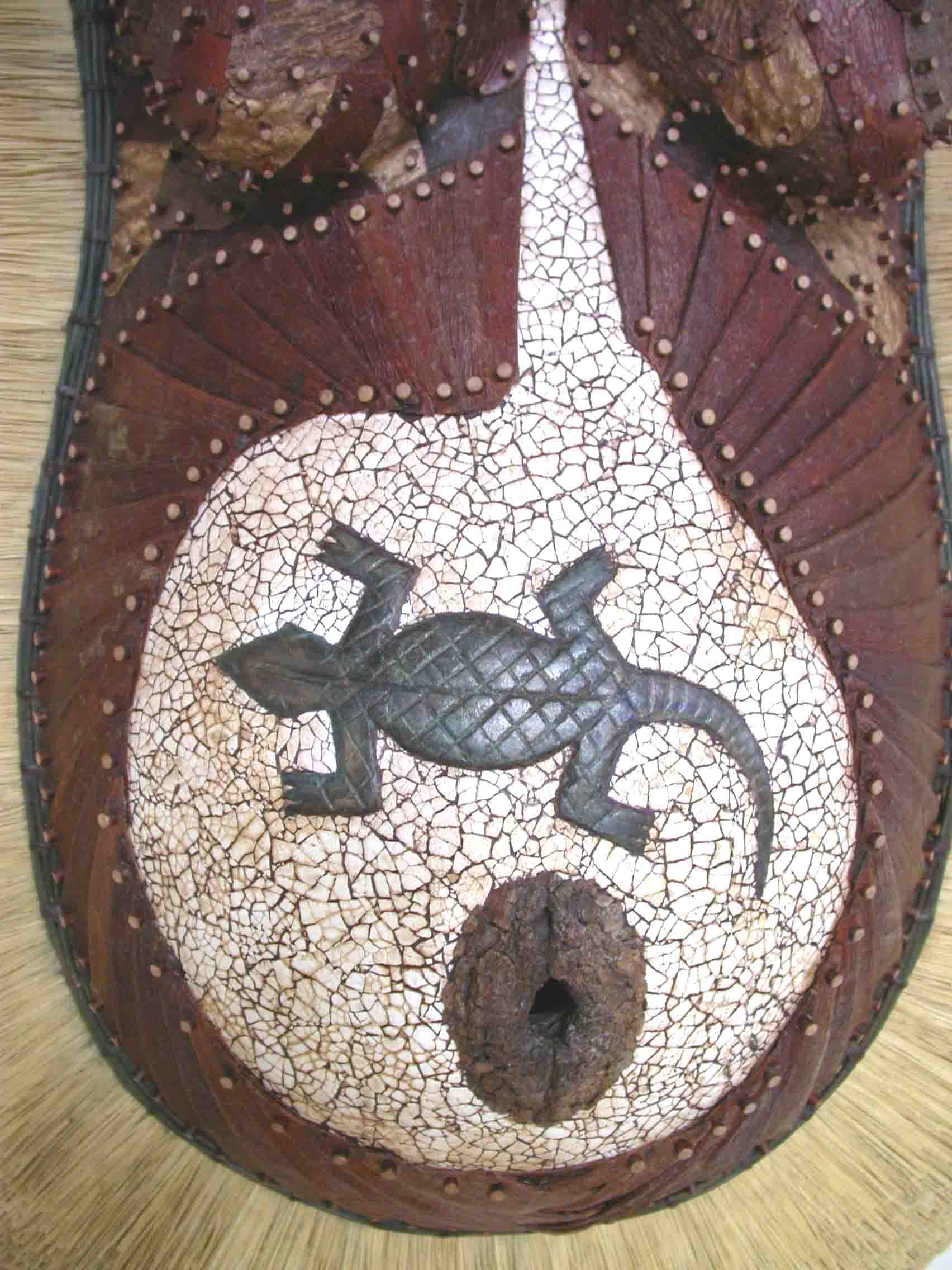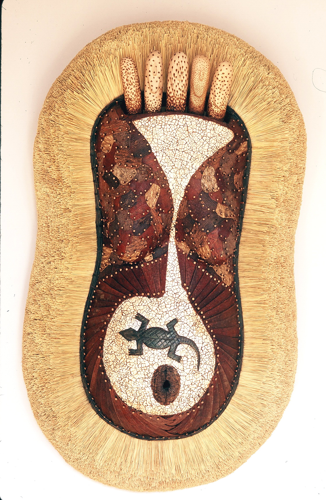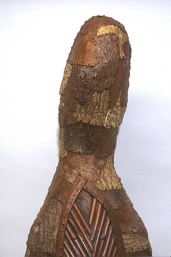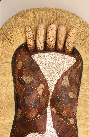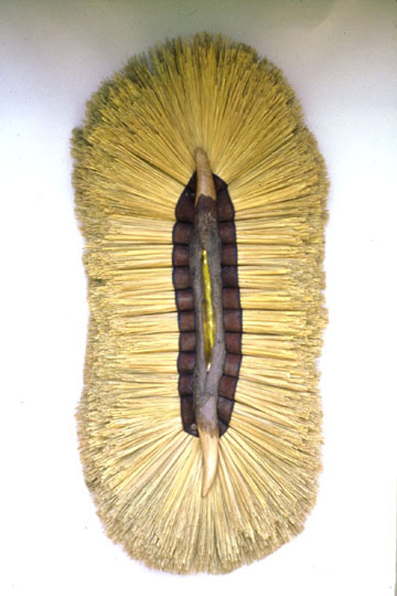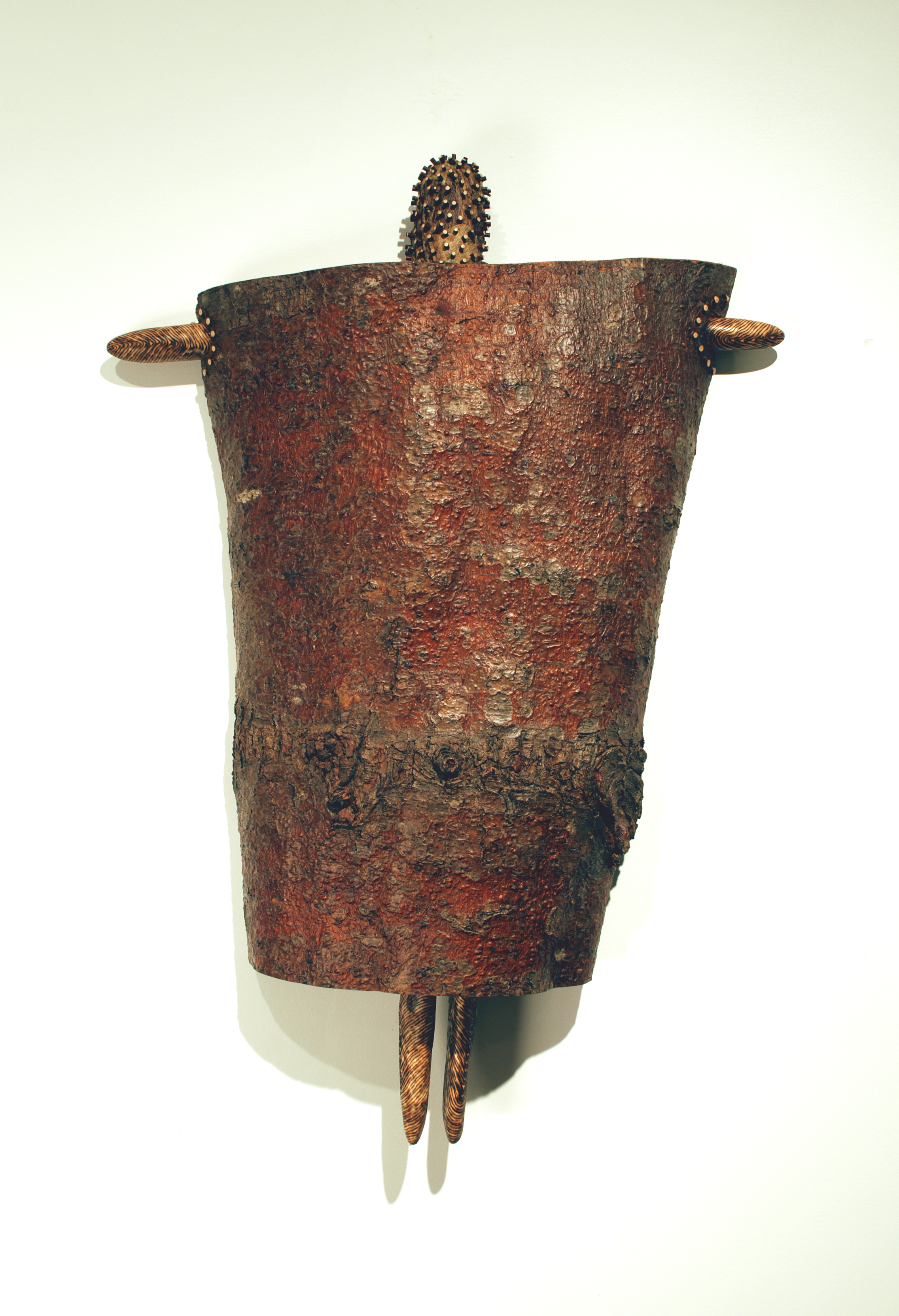 "Pregnant Warrior" Tanzanian fertility mask, broom corn, maple, eggshell mosaic, paint, various barks, sweet birch, fiber, 25"w x 42"h x 8"d 2006 $9500