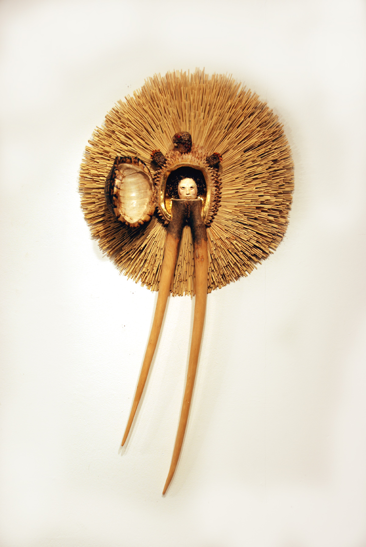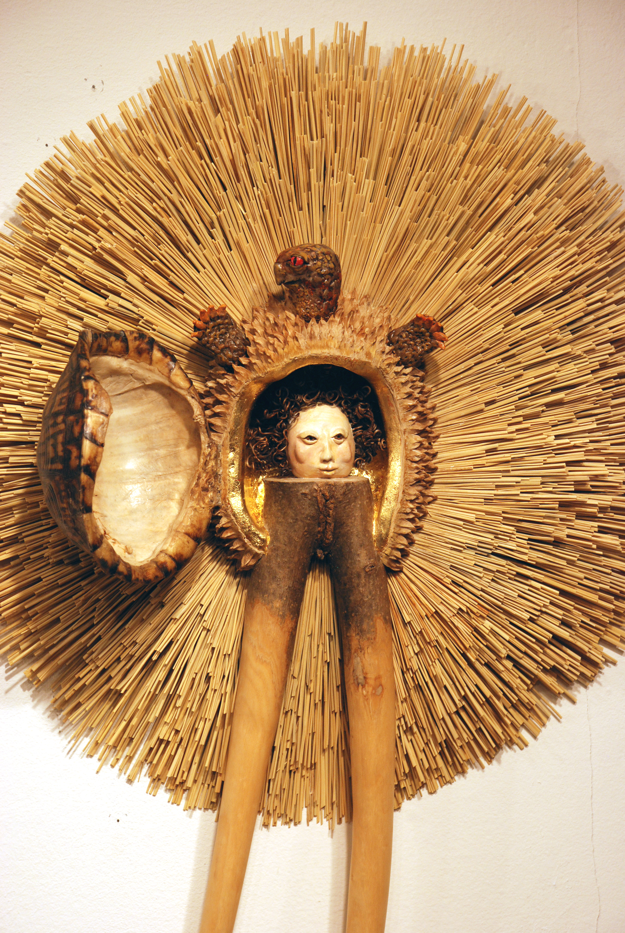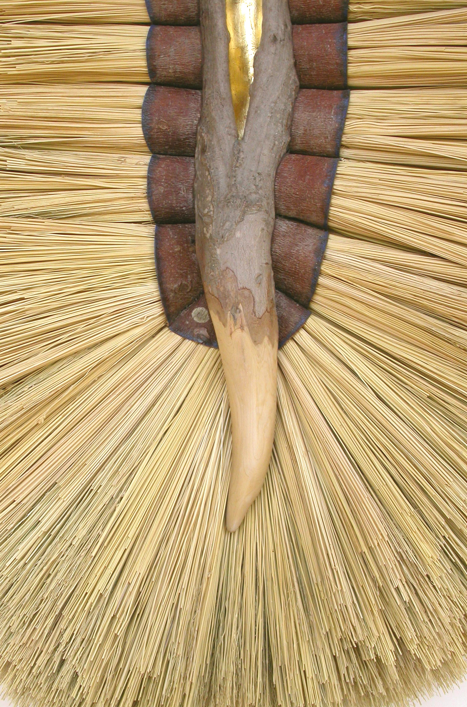 "Margaret's Dream" broom corn, turtle shell, clay, tulip poplar seed, grapevine tendrils, maple, metal leaf, paint, 2010 32"h x 17"w x 4.5"d $2200
