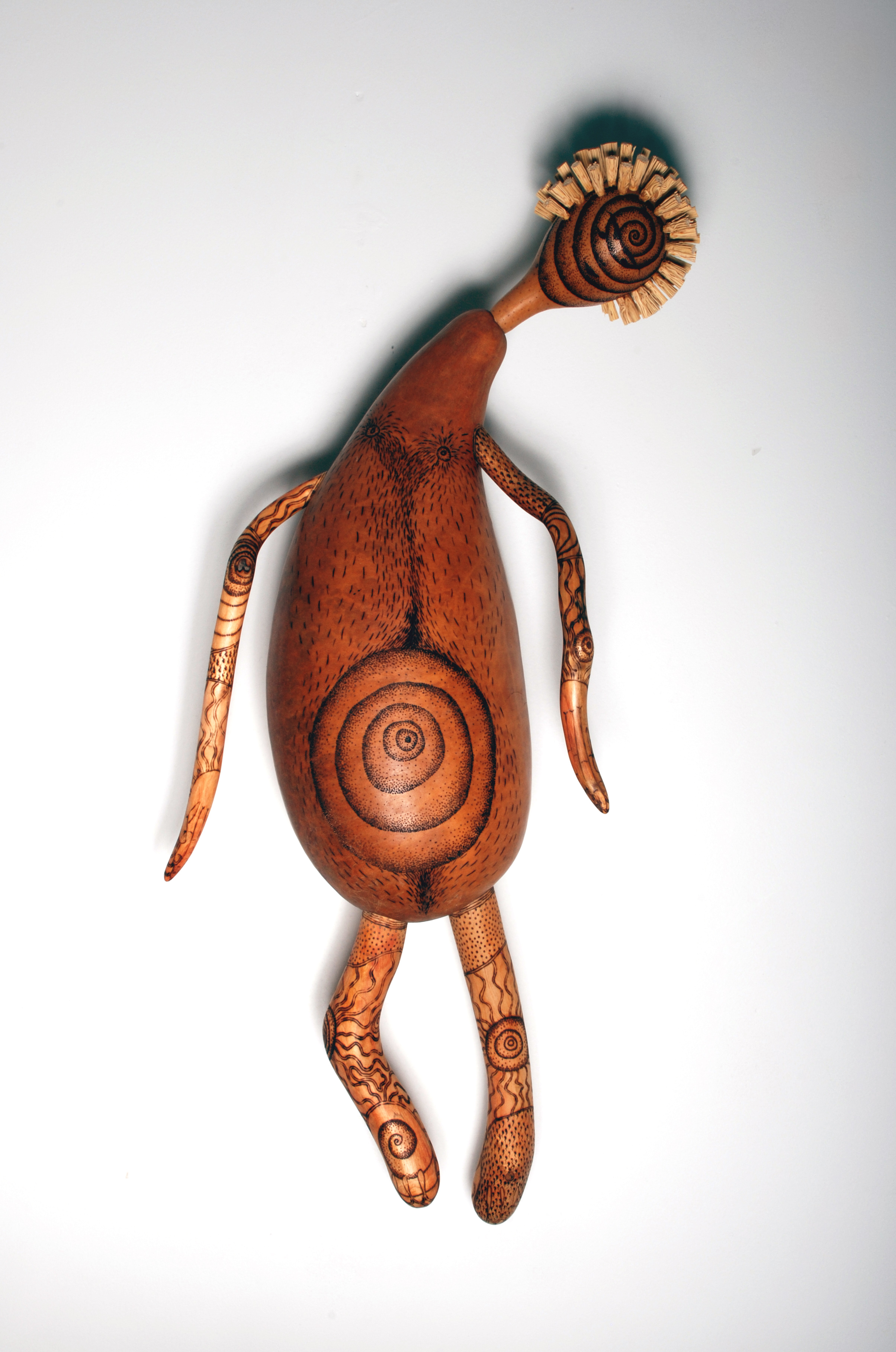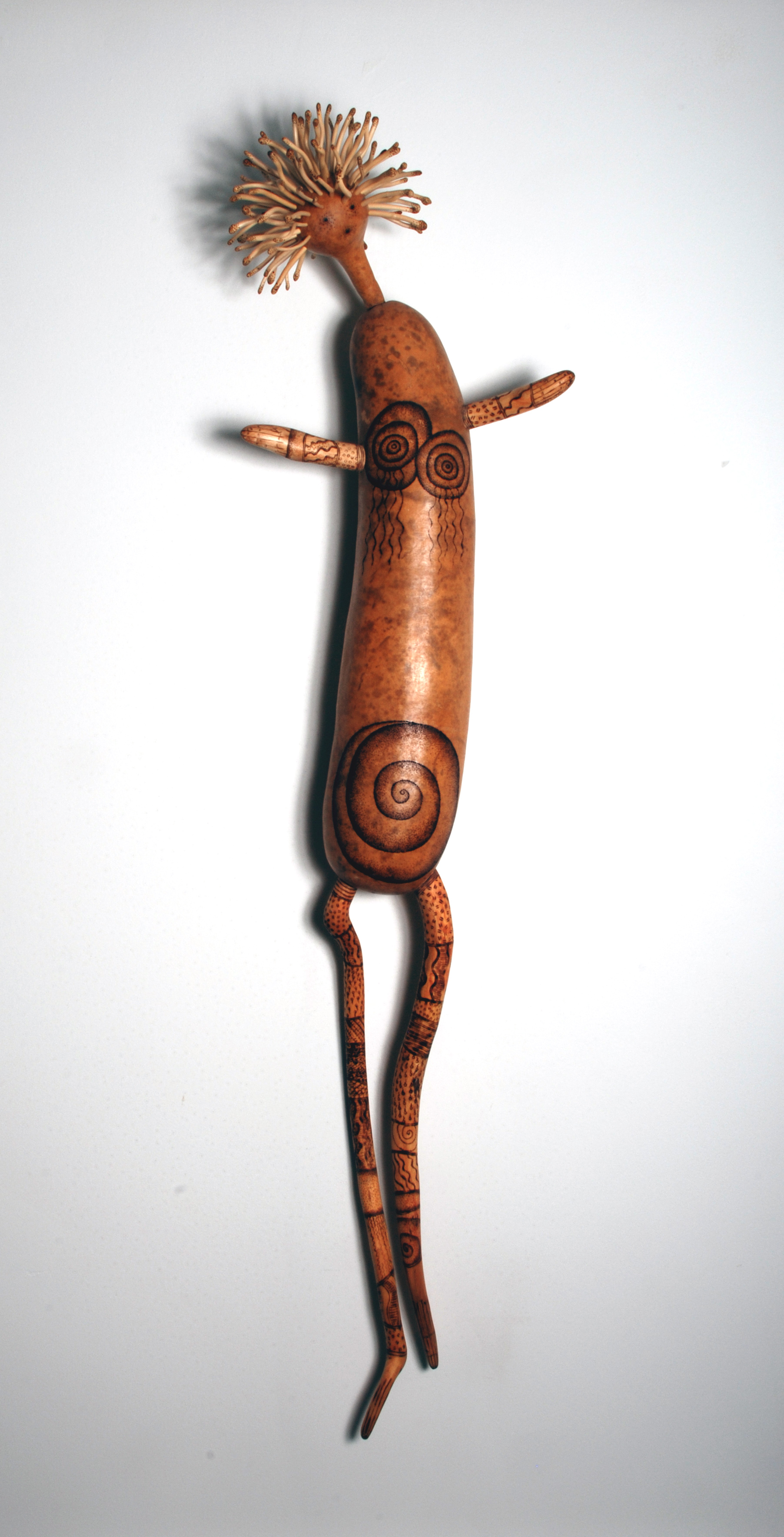"Wally" gourd, maple, broom corn, wood burned 2010 $2200