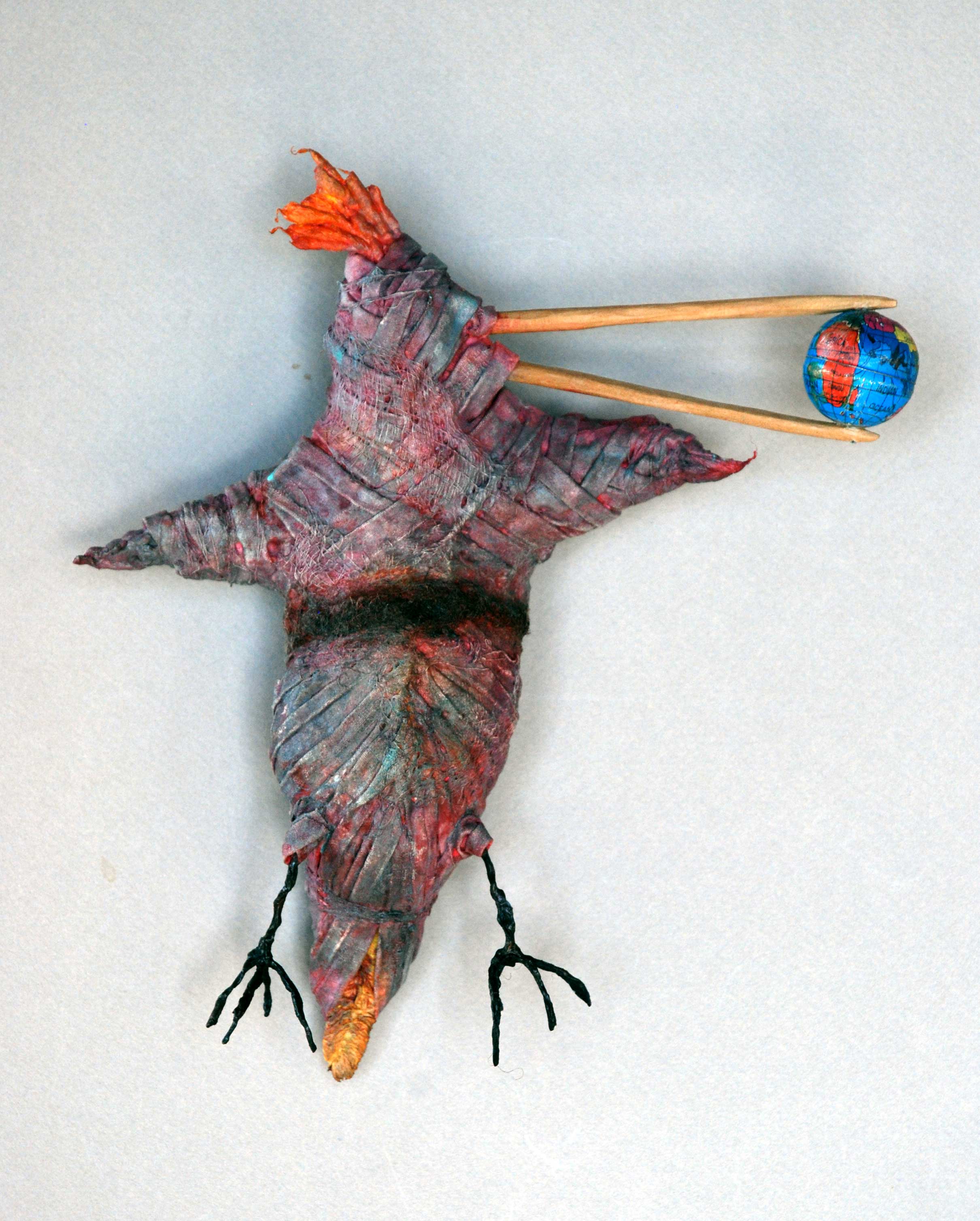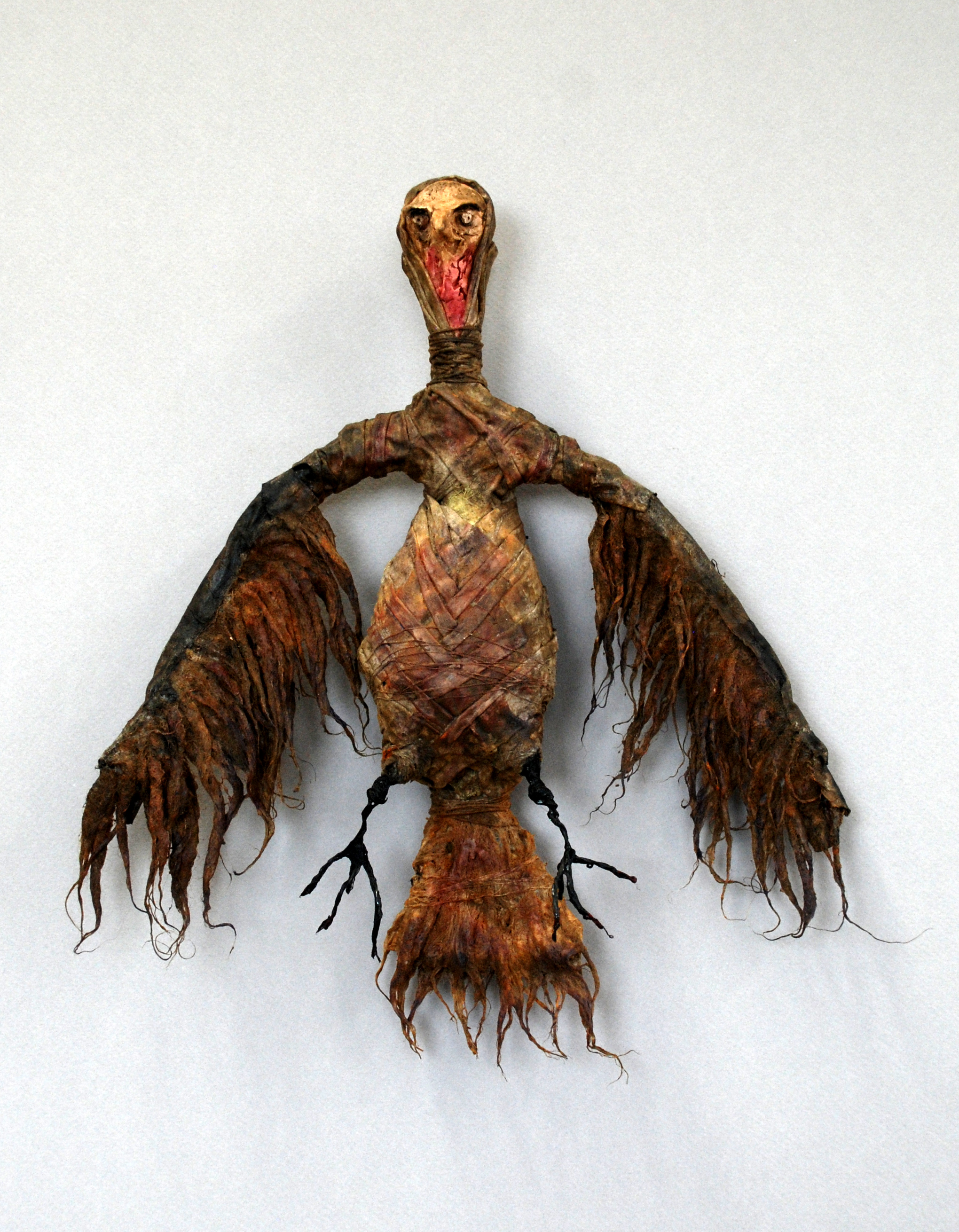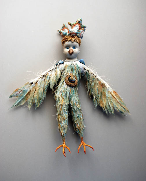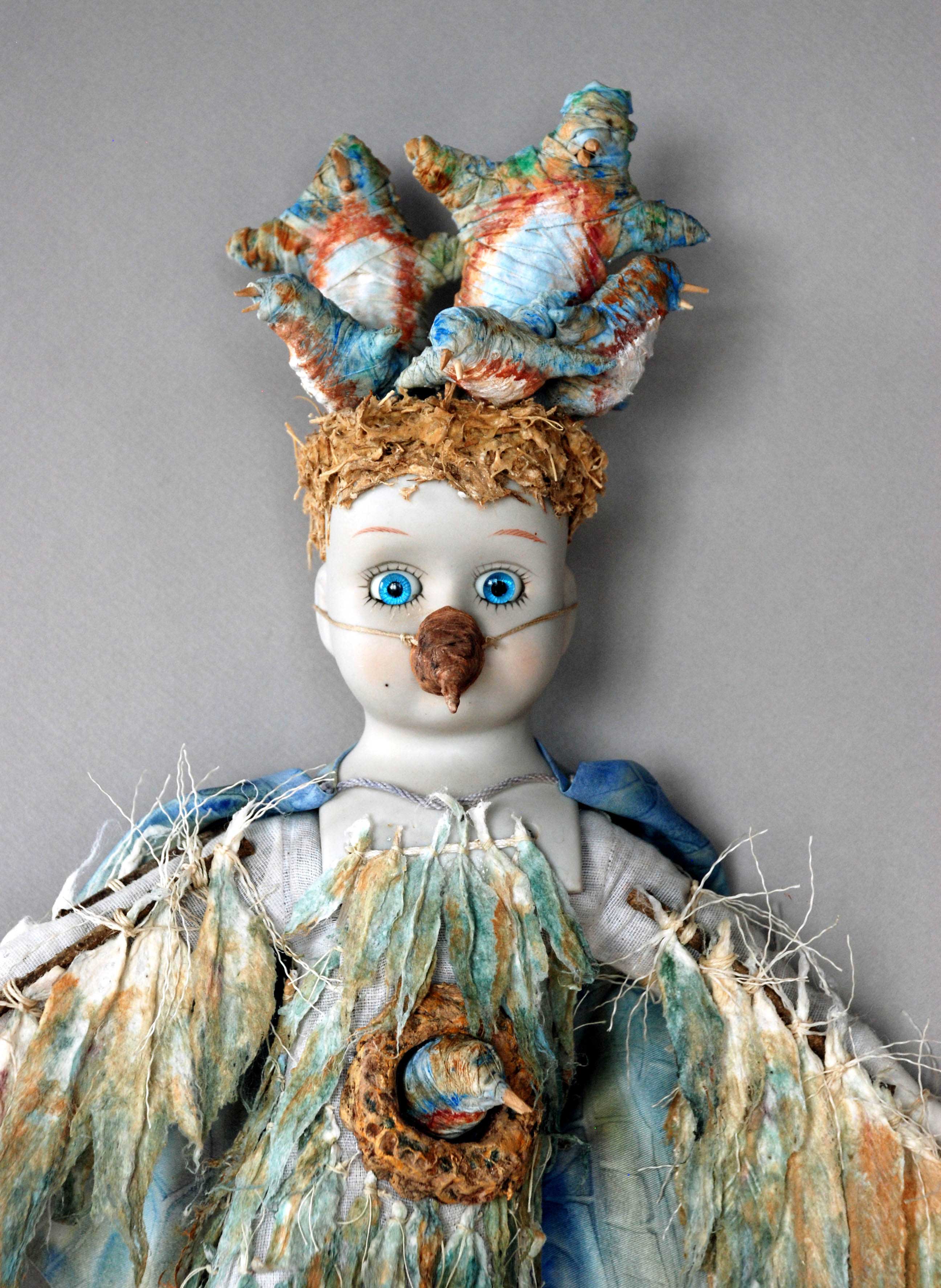 “Fledgling” repurposed doll, fiber, broom corn, wire, paint