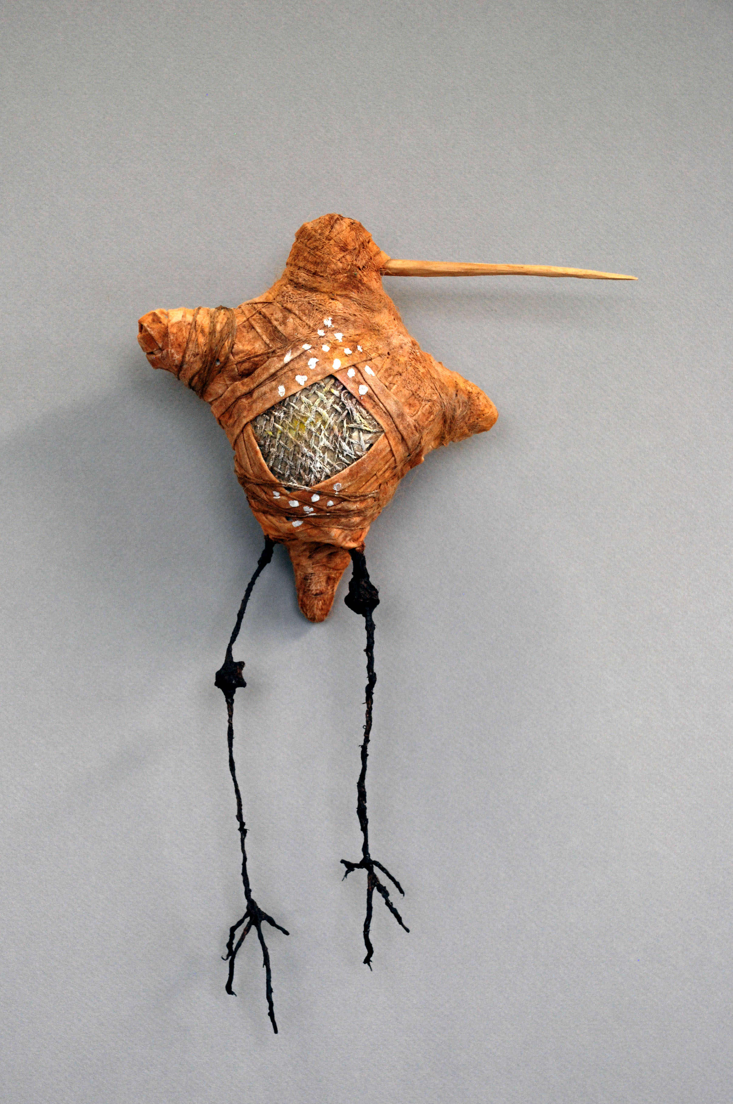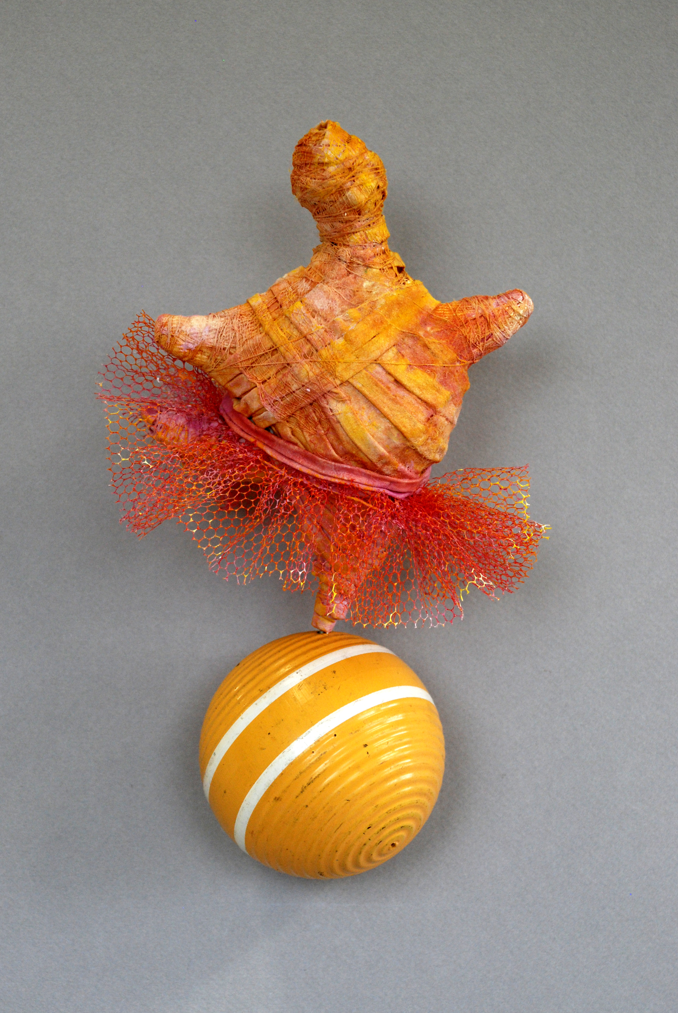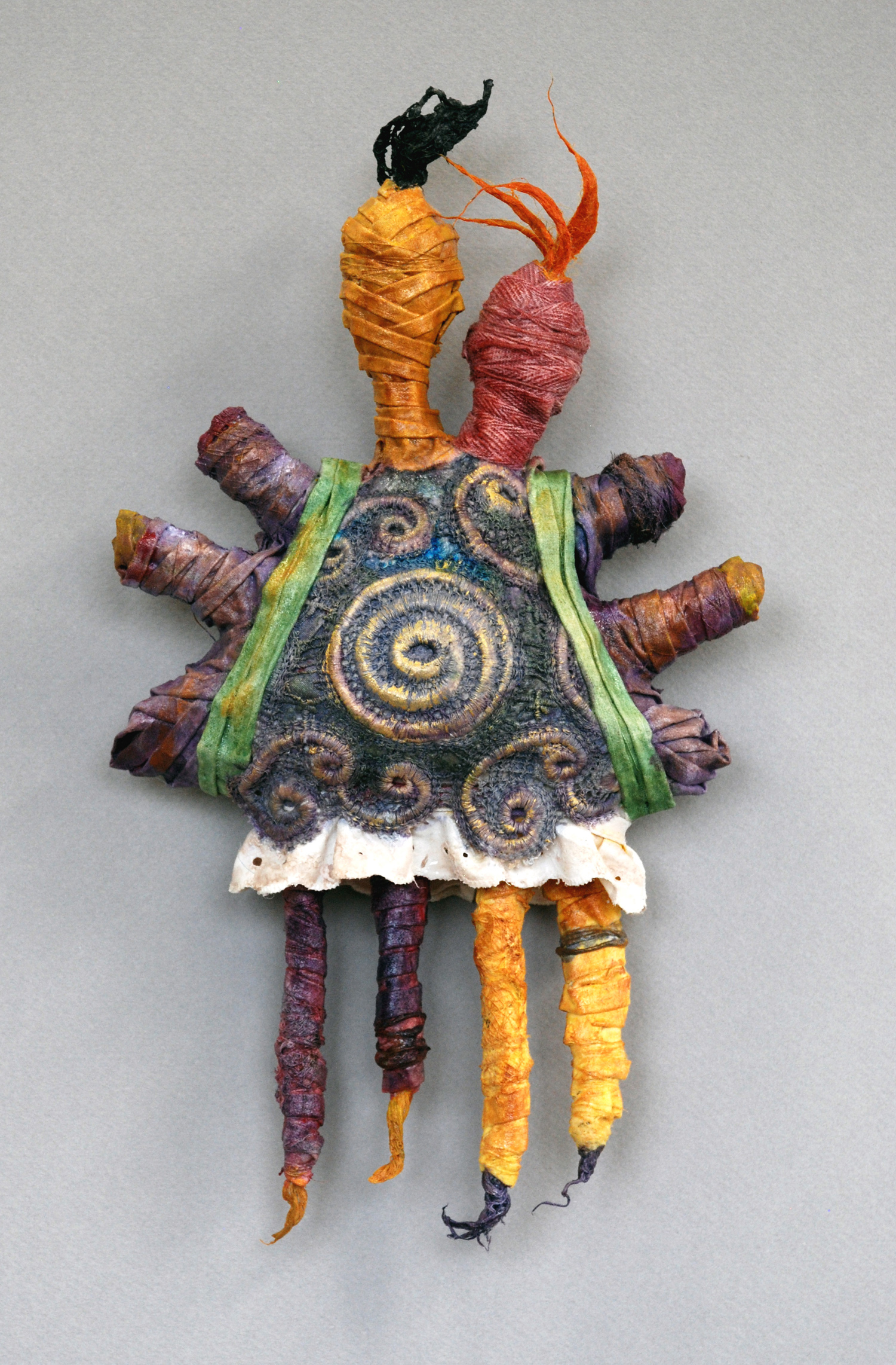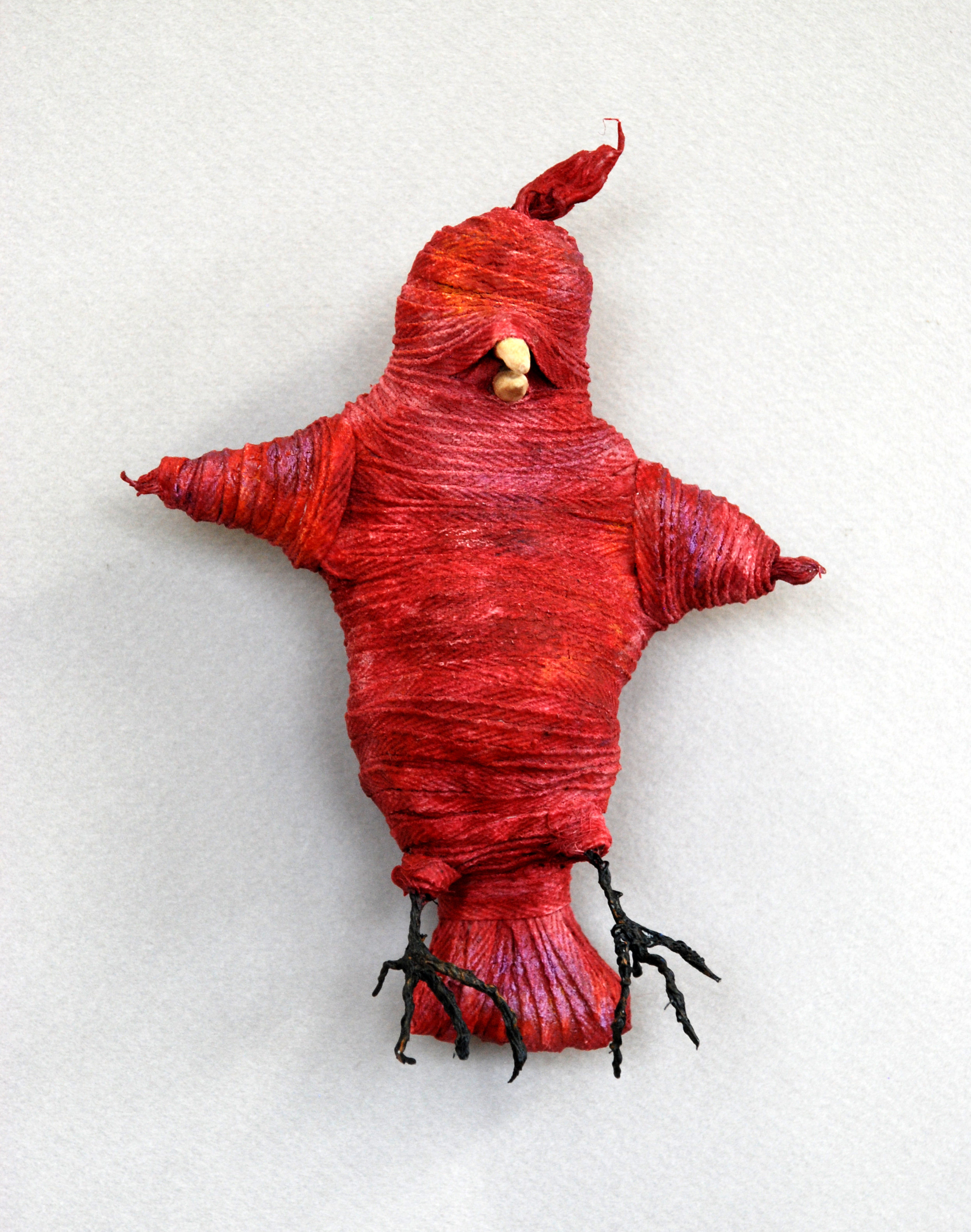 “Fledgling” repurposed doll, fiber, broom corn, wire, paint