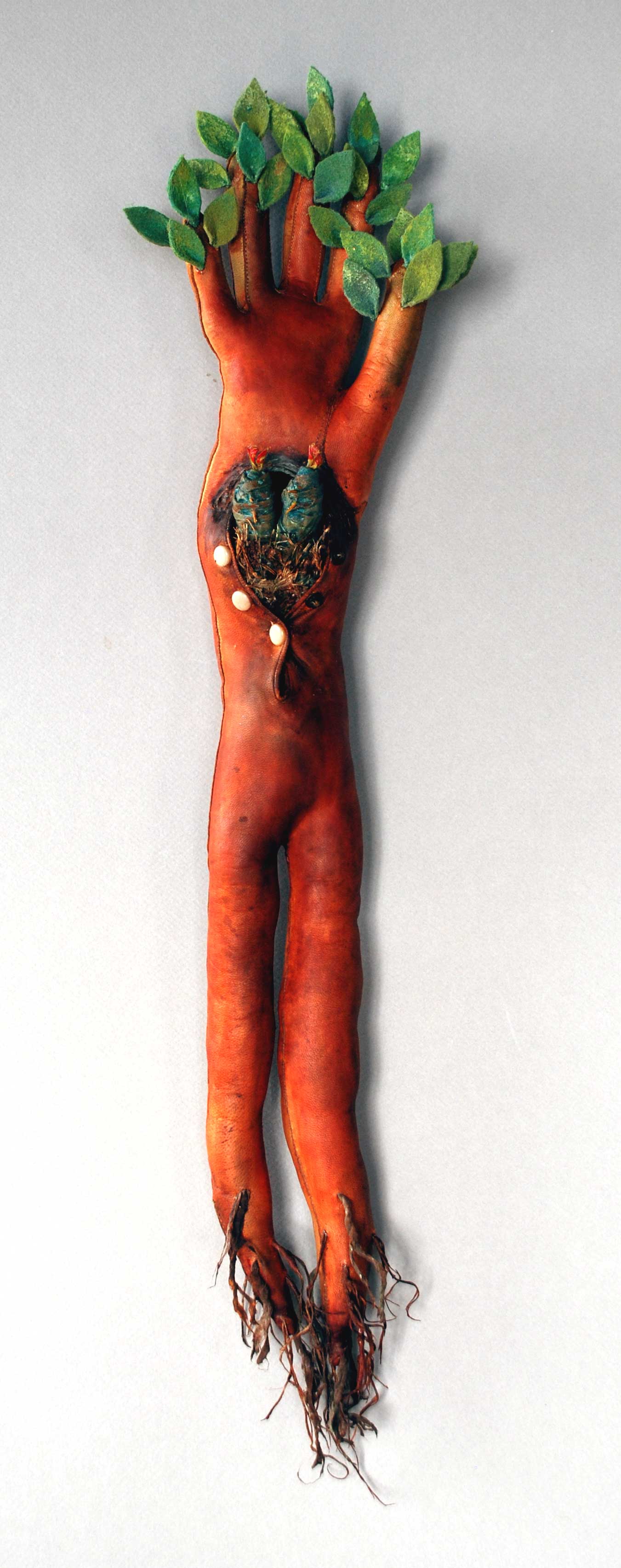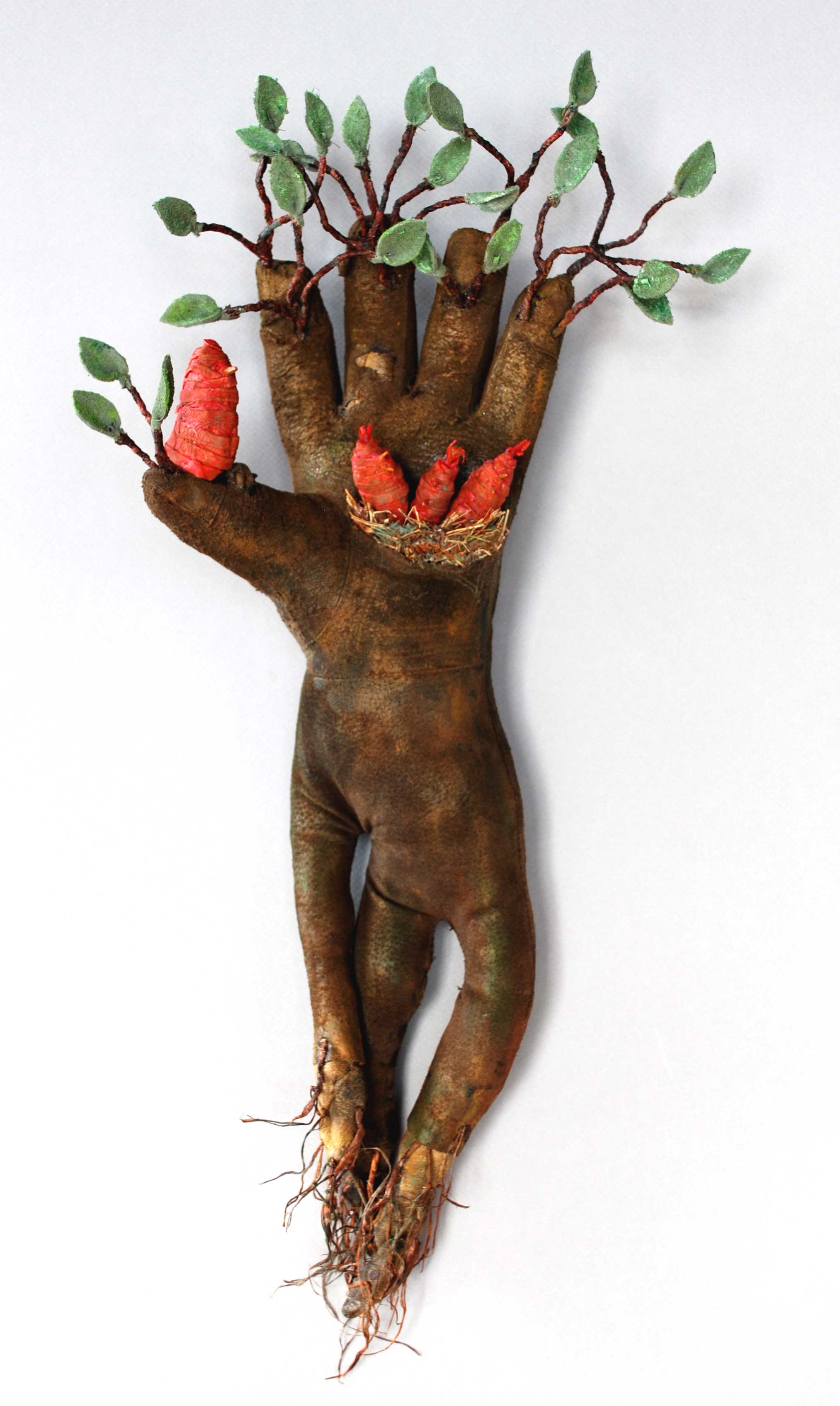 “A Tree Grows III” kid glove, fiber, wood, paint
