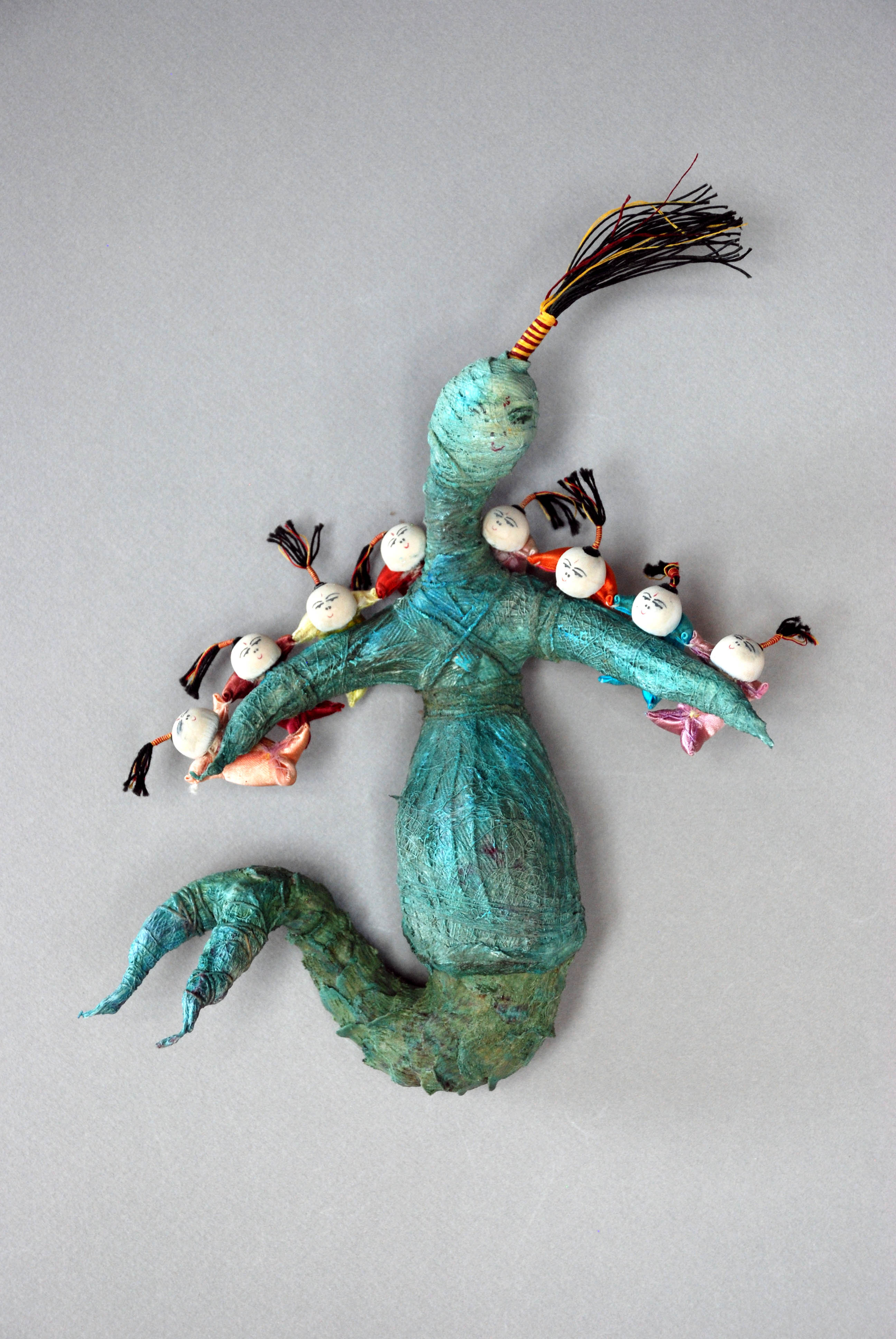 “MerMum” those little dolls around a pin cushion, horse hair, fiber, paint