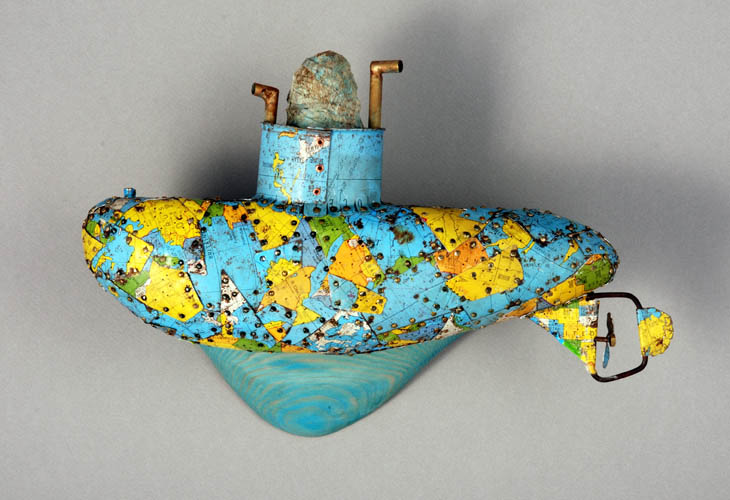 “Searching for The Yellow Submarine” old metal globe, brads, wood, fiber, copper pipe
