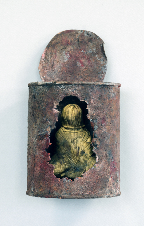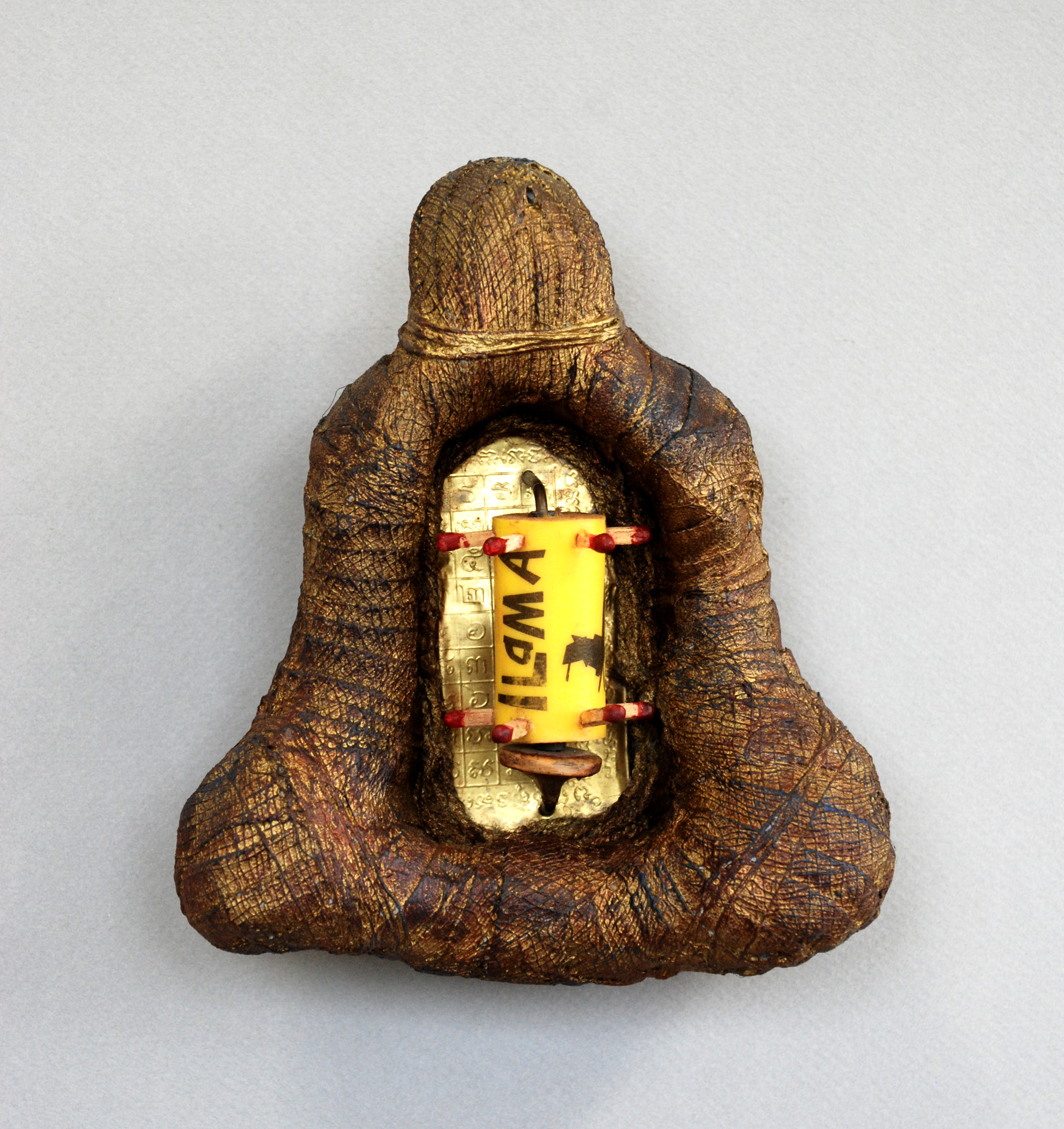 “Prayer Wheel” wine cork, matches, metal amulet from Thailand, fiber, paint