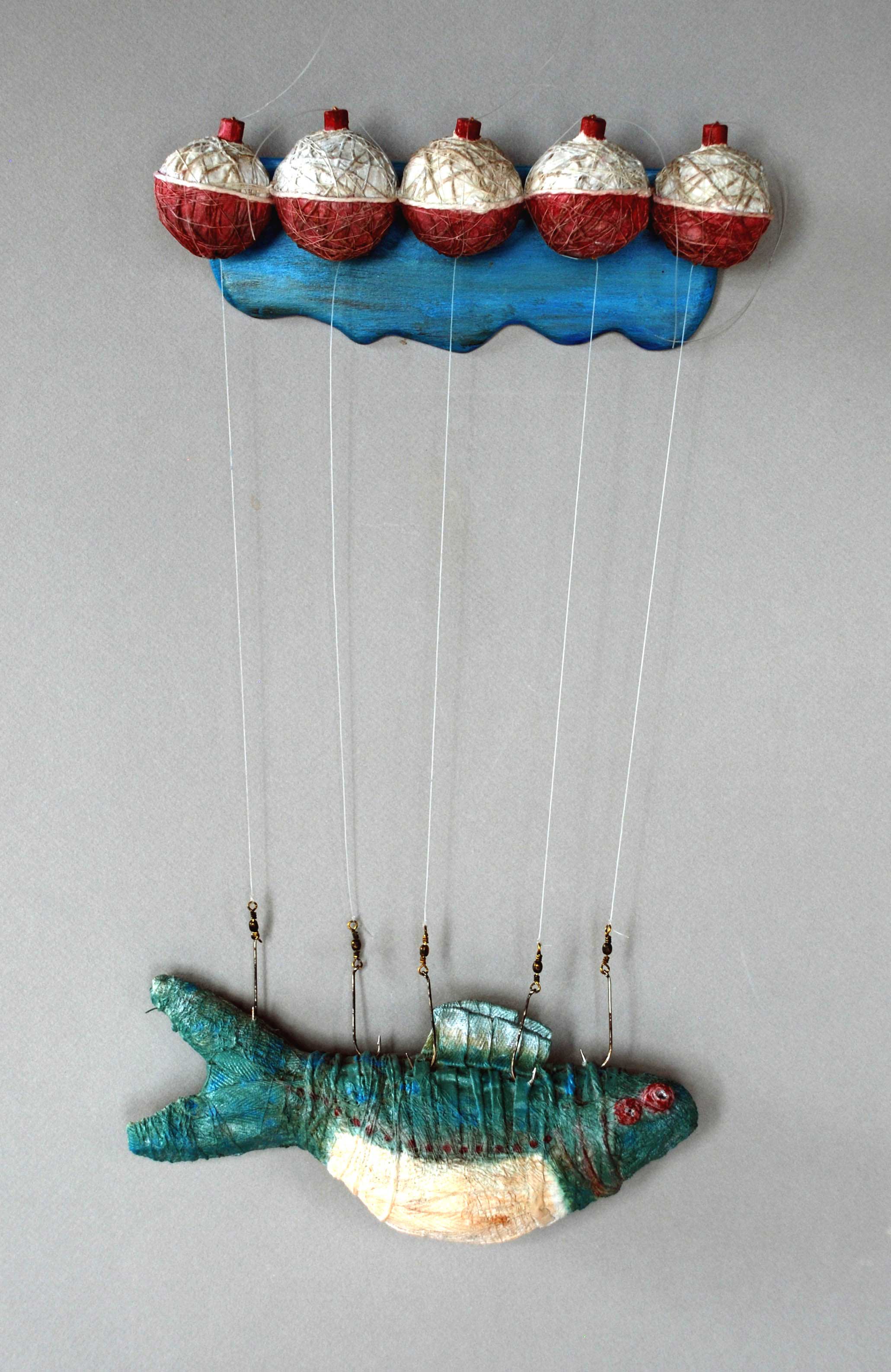 “Gone Fishin” fiber, wood, fishing hooks and line, paint