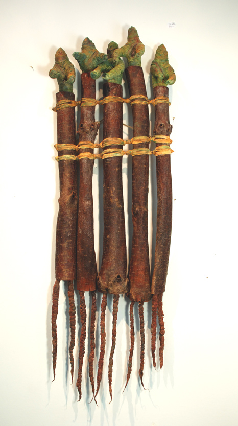 Shown here "Tribe, From Little Acorns" fiber, acorns, paint 9 1/2"h x 26"w x 3 1/2"d $425