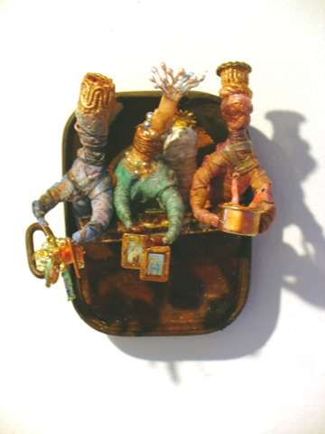 "Baby Jesus and the Three Wise Mummies", sardine can, fiber, paint, found objects