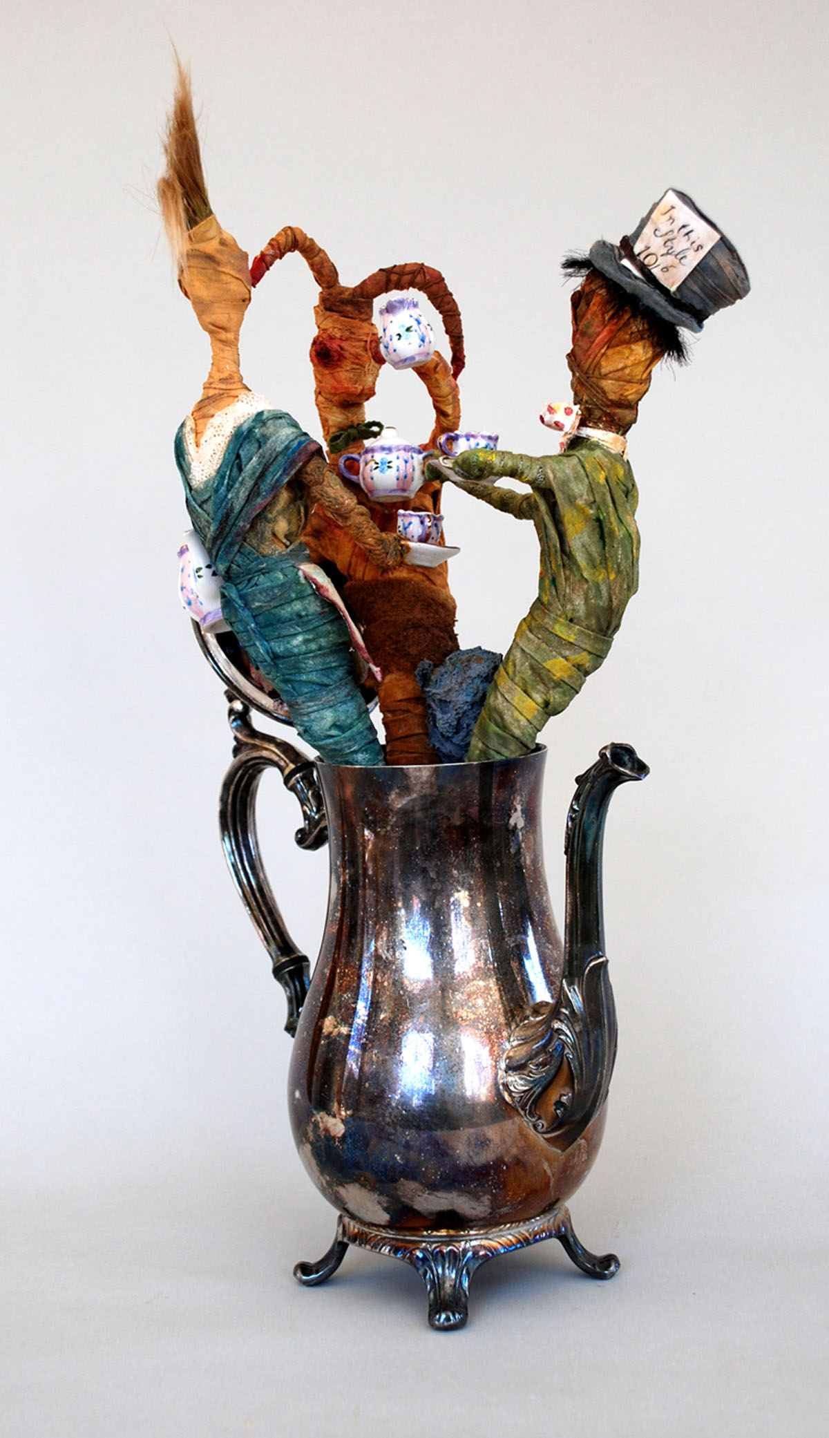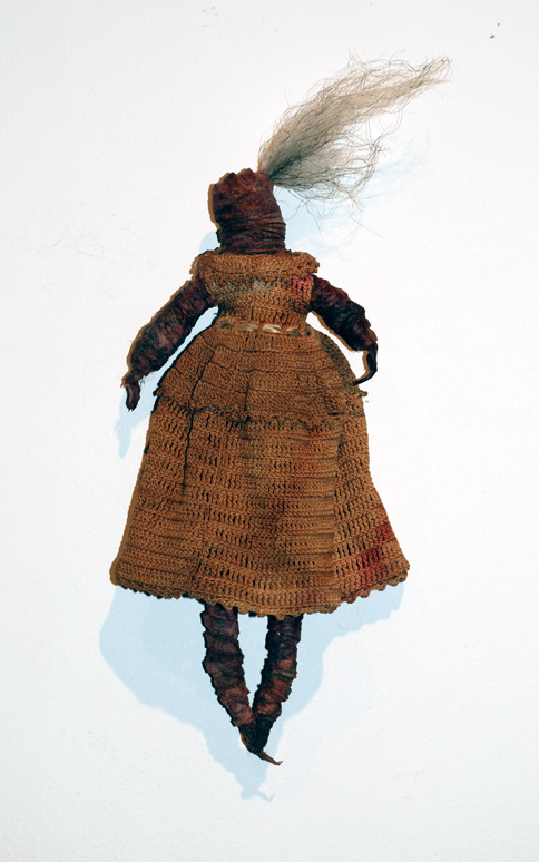 "Alice in Mummyland" found objects, fiber, paint, human hair