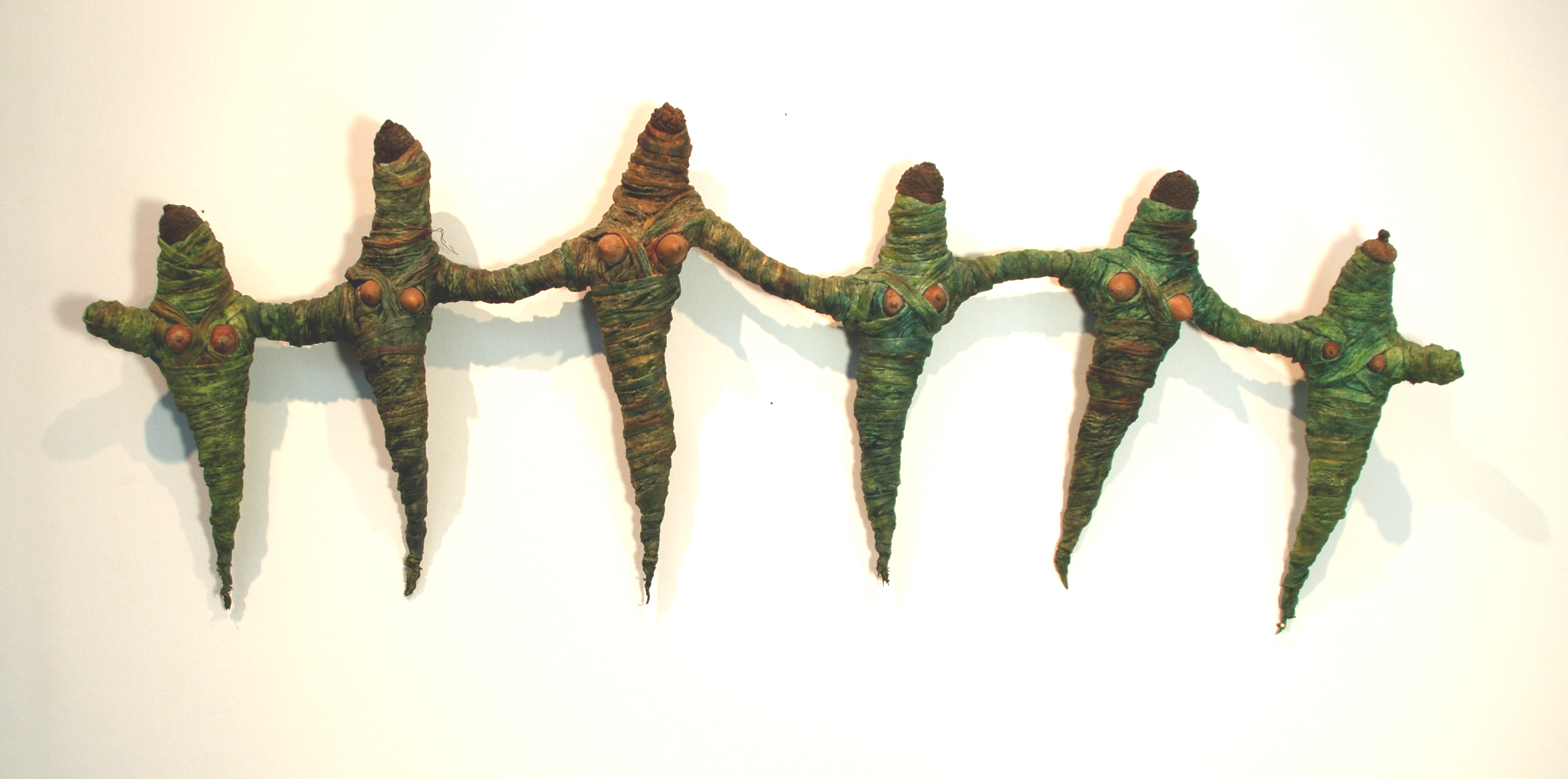 Exploring my fascination with the late Greek and Roman mummy forms, I spent my first winter home from Thailand wrapping both fiber (using wallpaper paste, acrylic and oil paint, and oil pastel), and clay covered fiber that was subsequently fired. The frontal aspect, of being encased shows up in many of the mummies, but I also feel entities wanting to emerge from their wrappings.