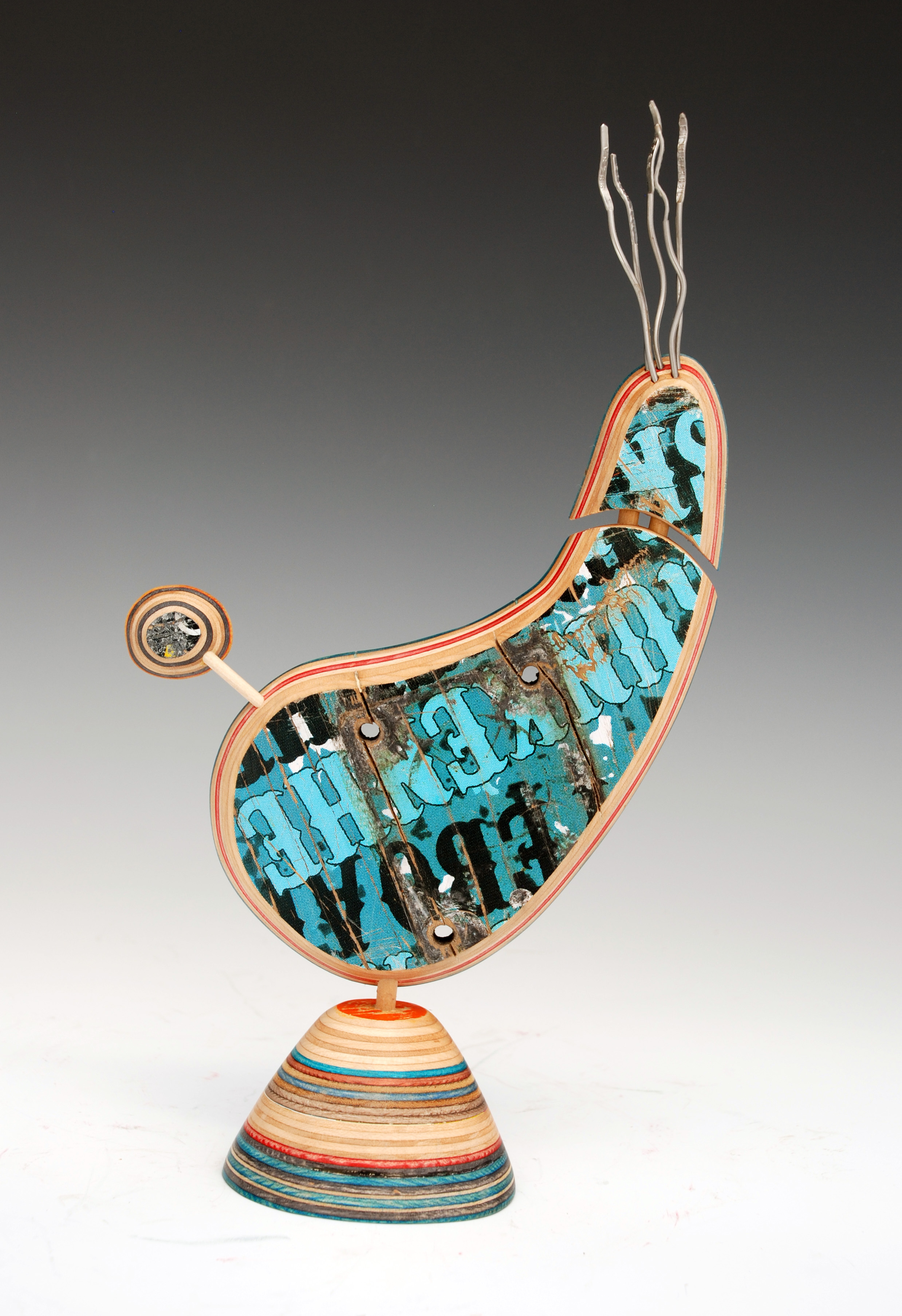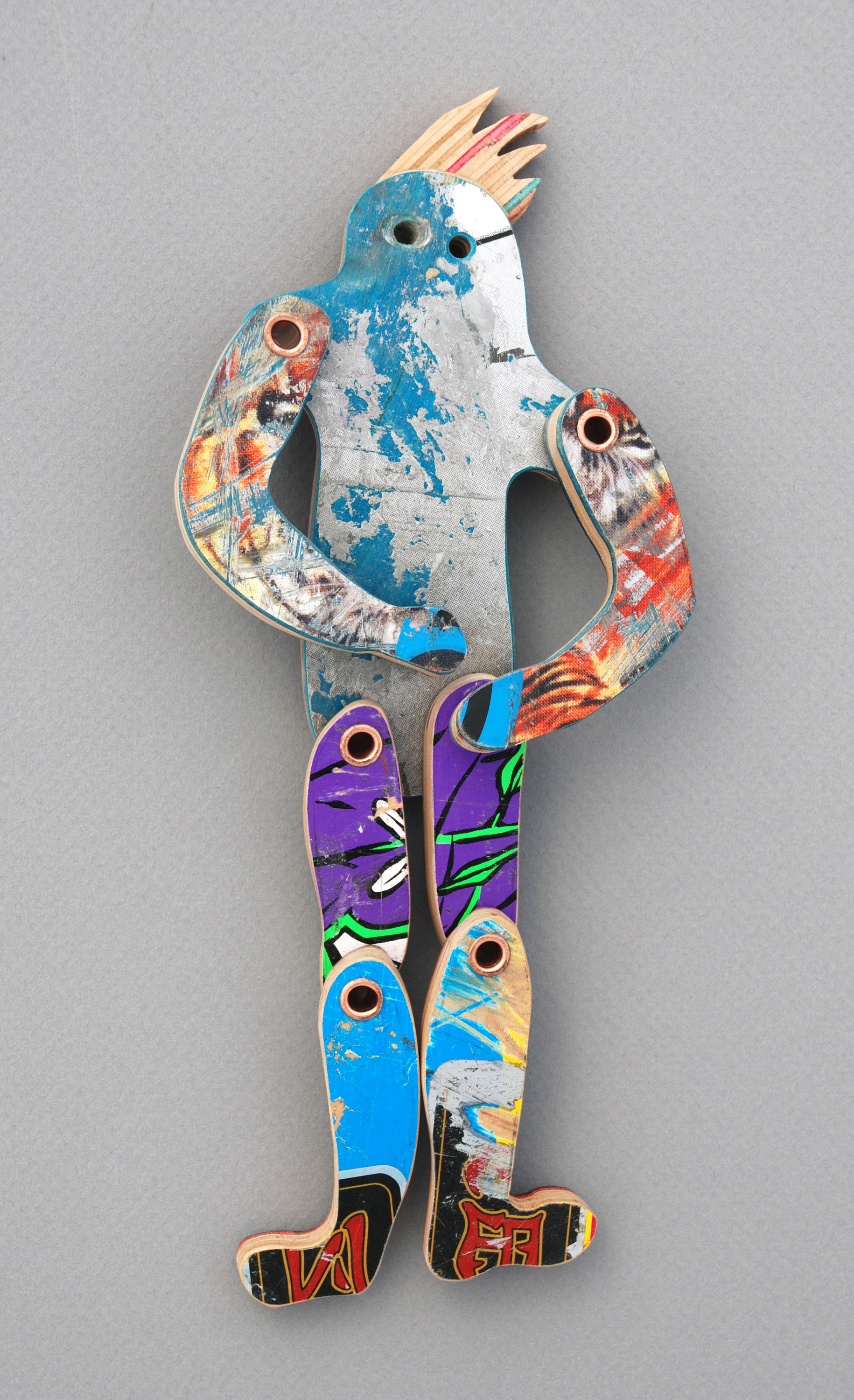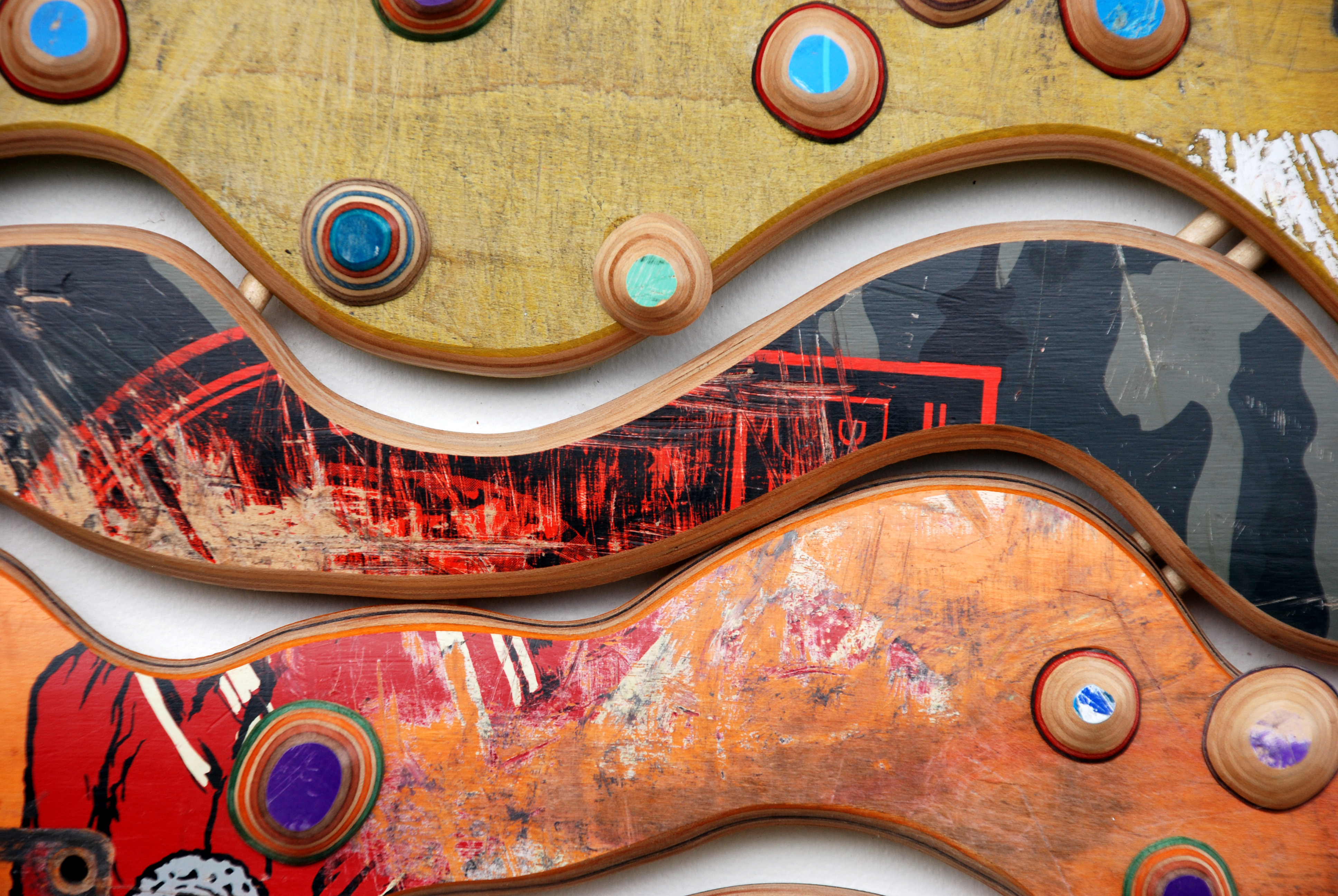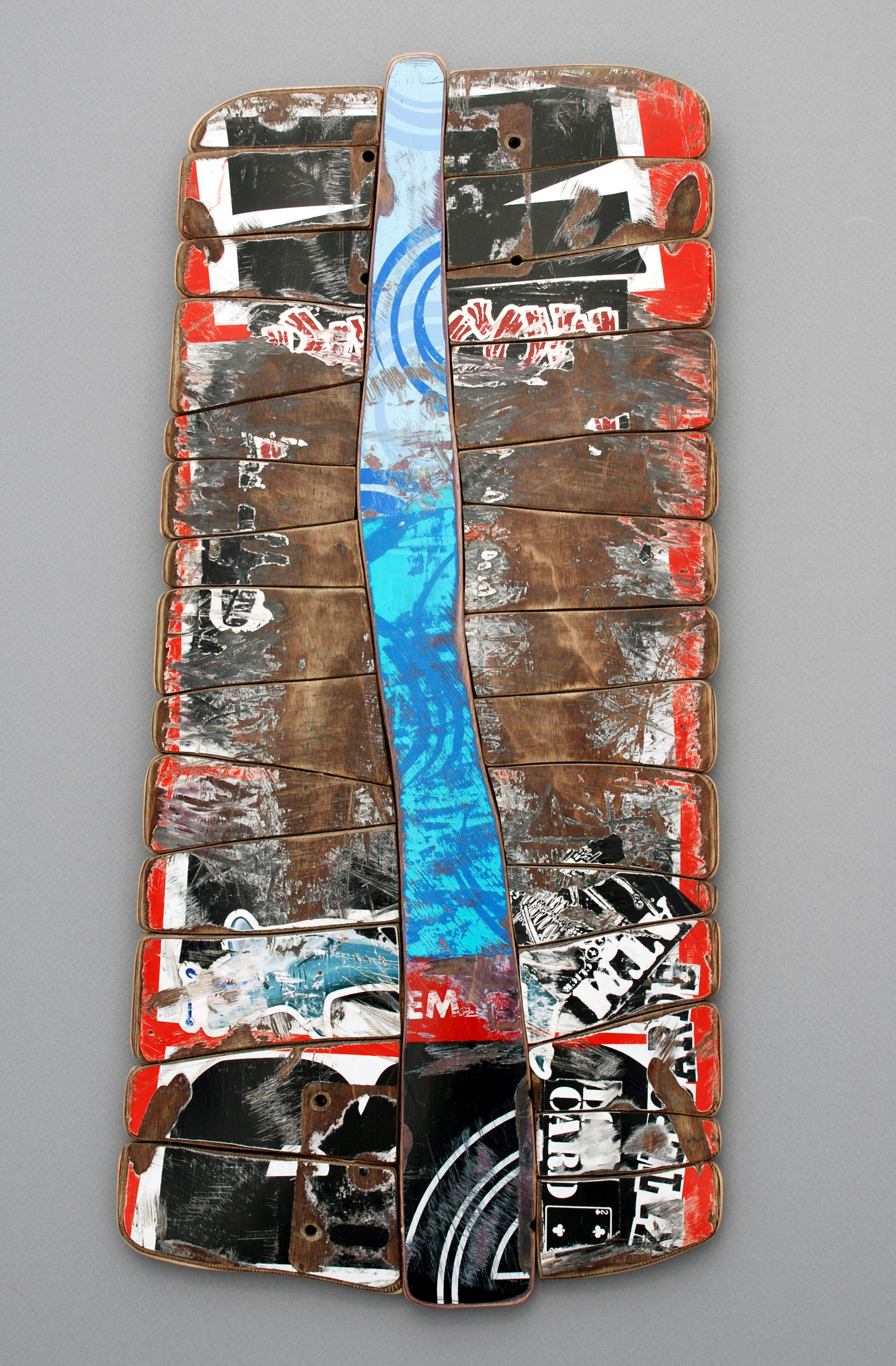 I have loved the simplicity of working with only one material (well there are some dowels and wire), just delving as to possibilities, learning to work with the curving nature of the decks always focused on the distressed graphics.