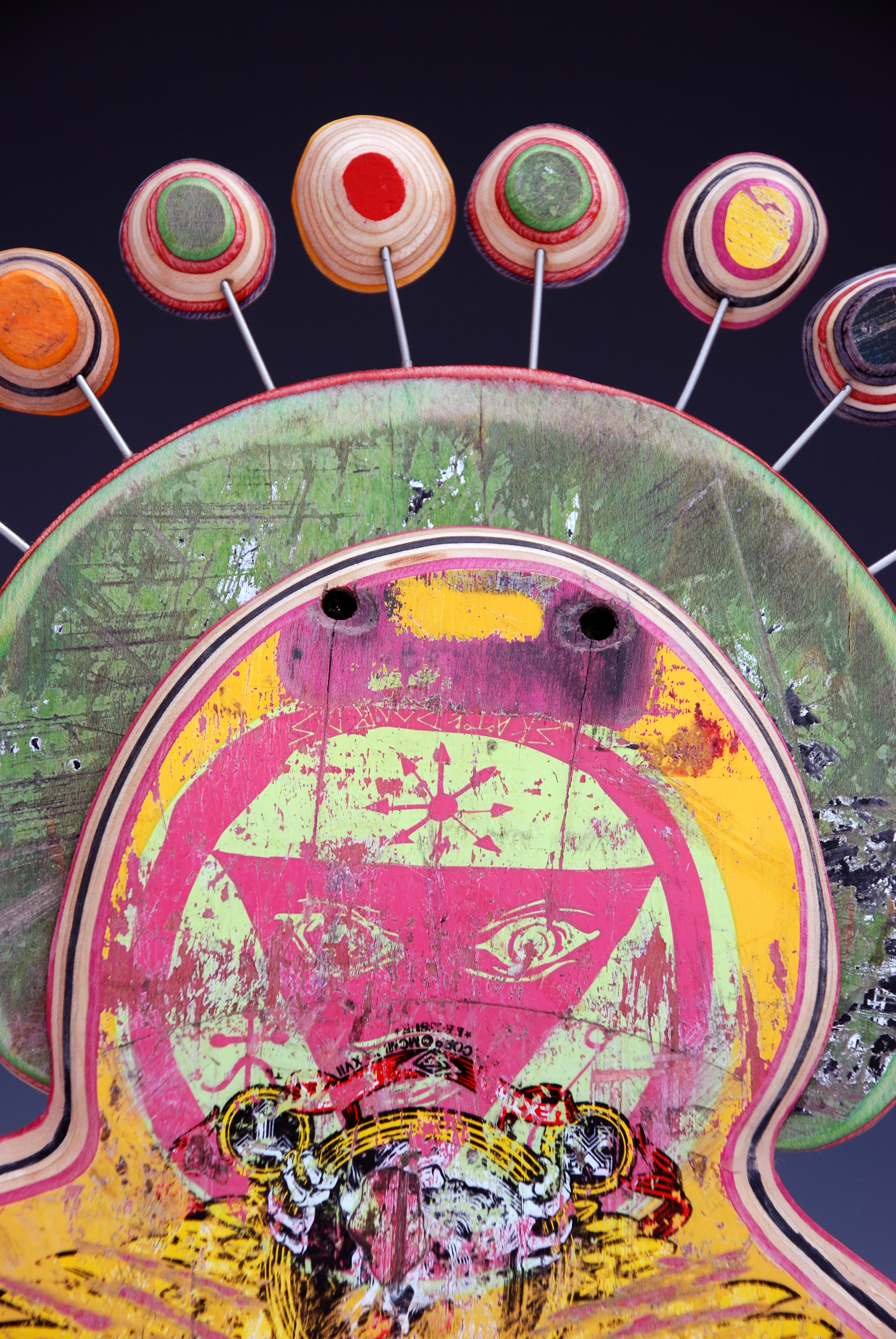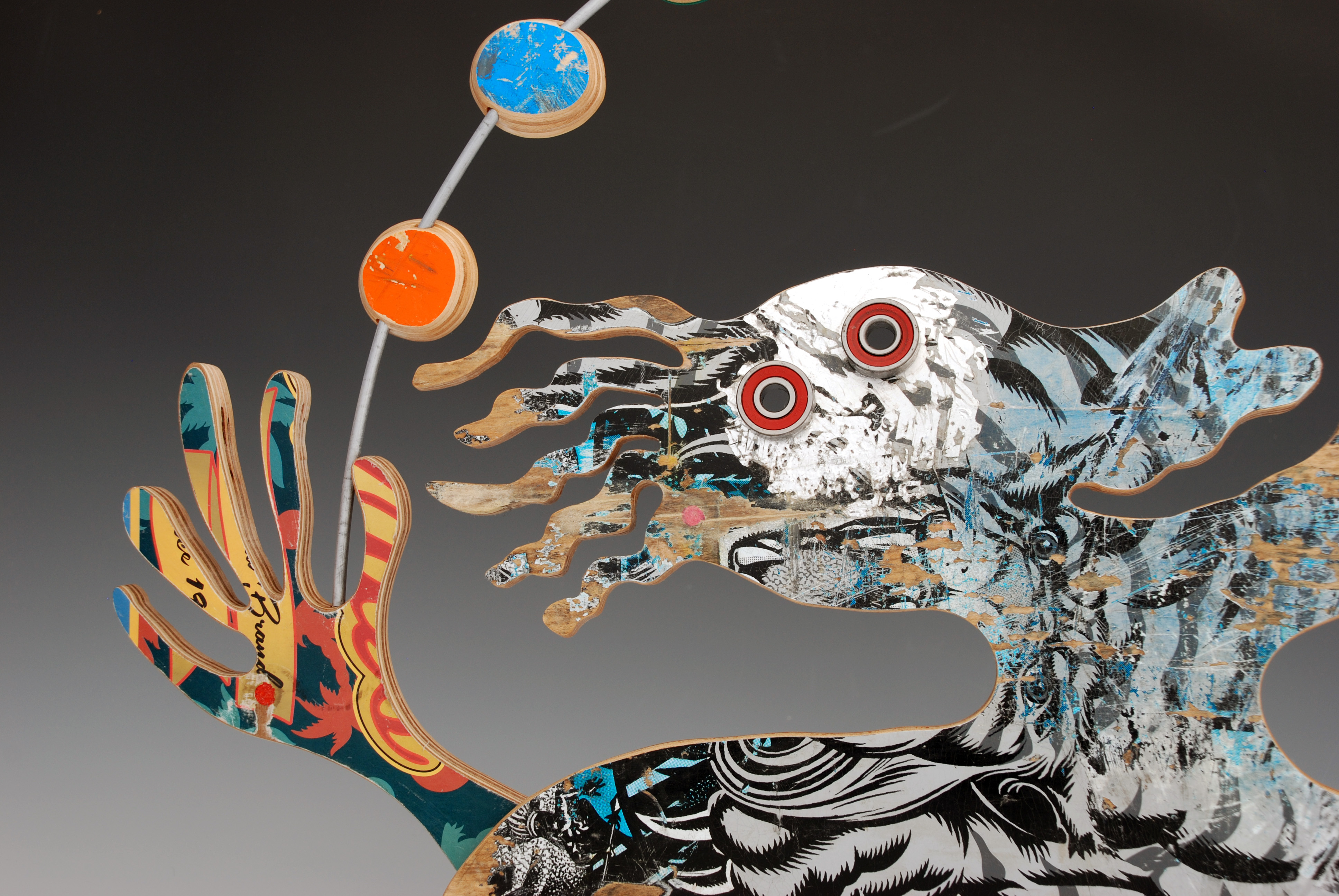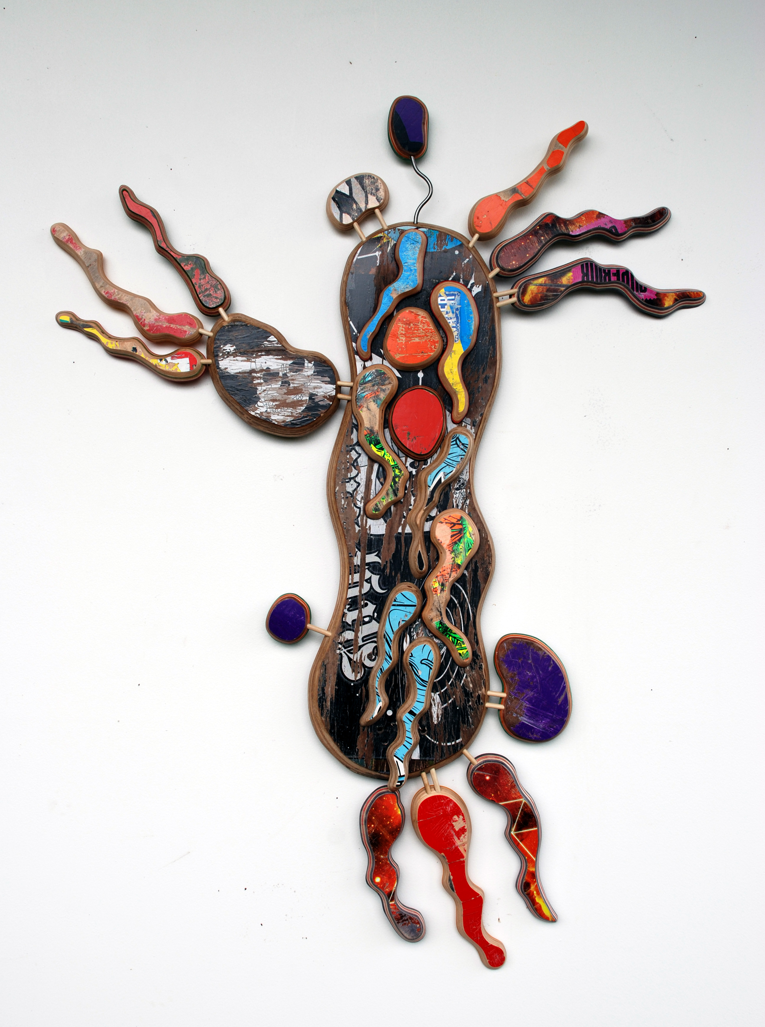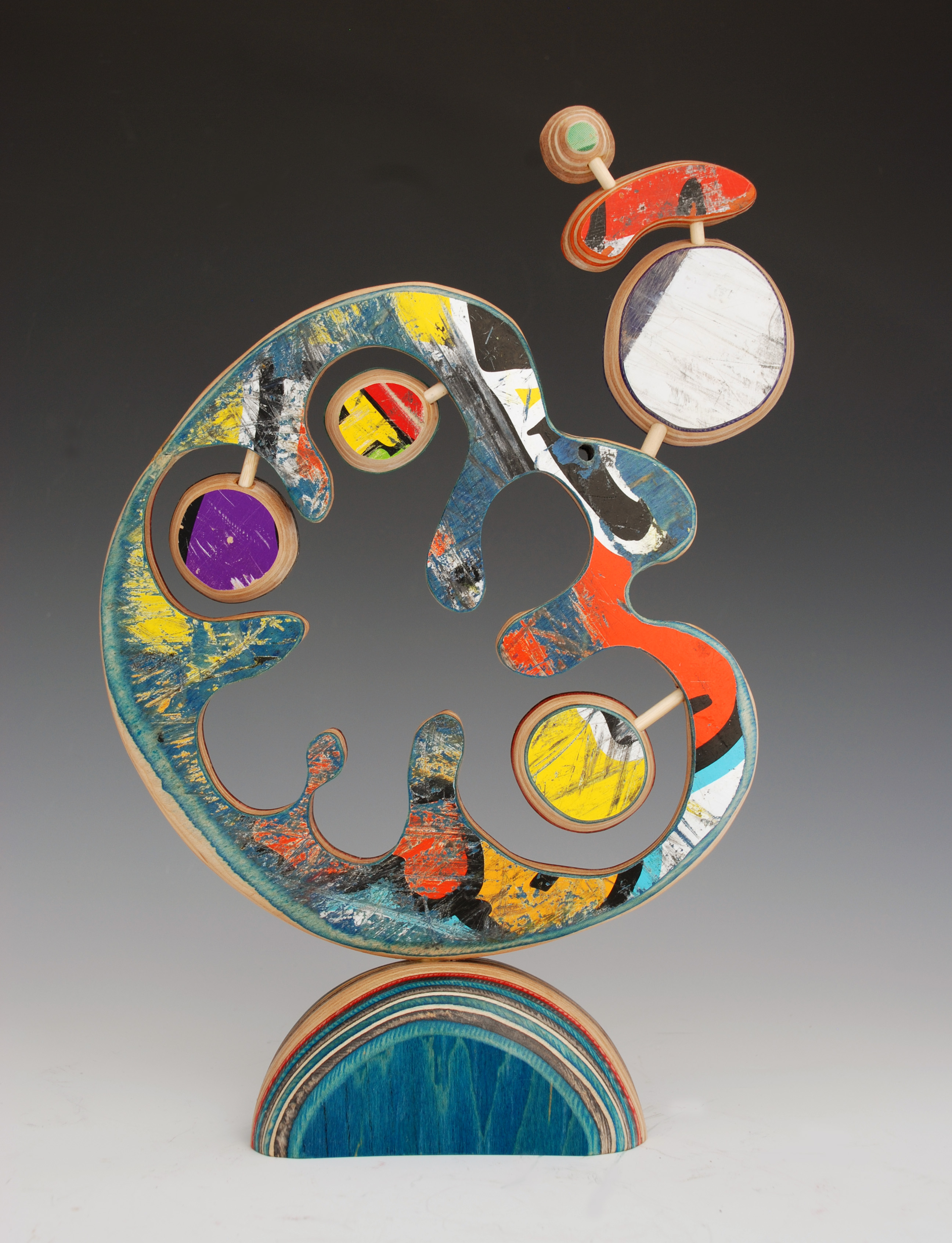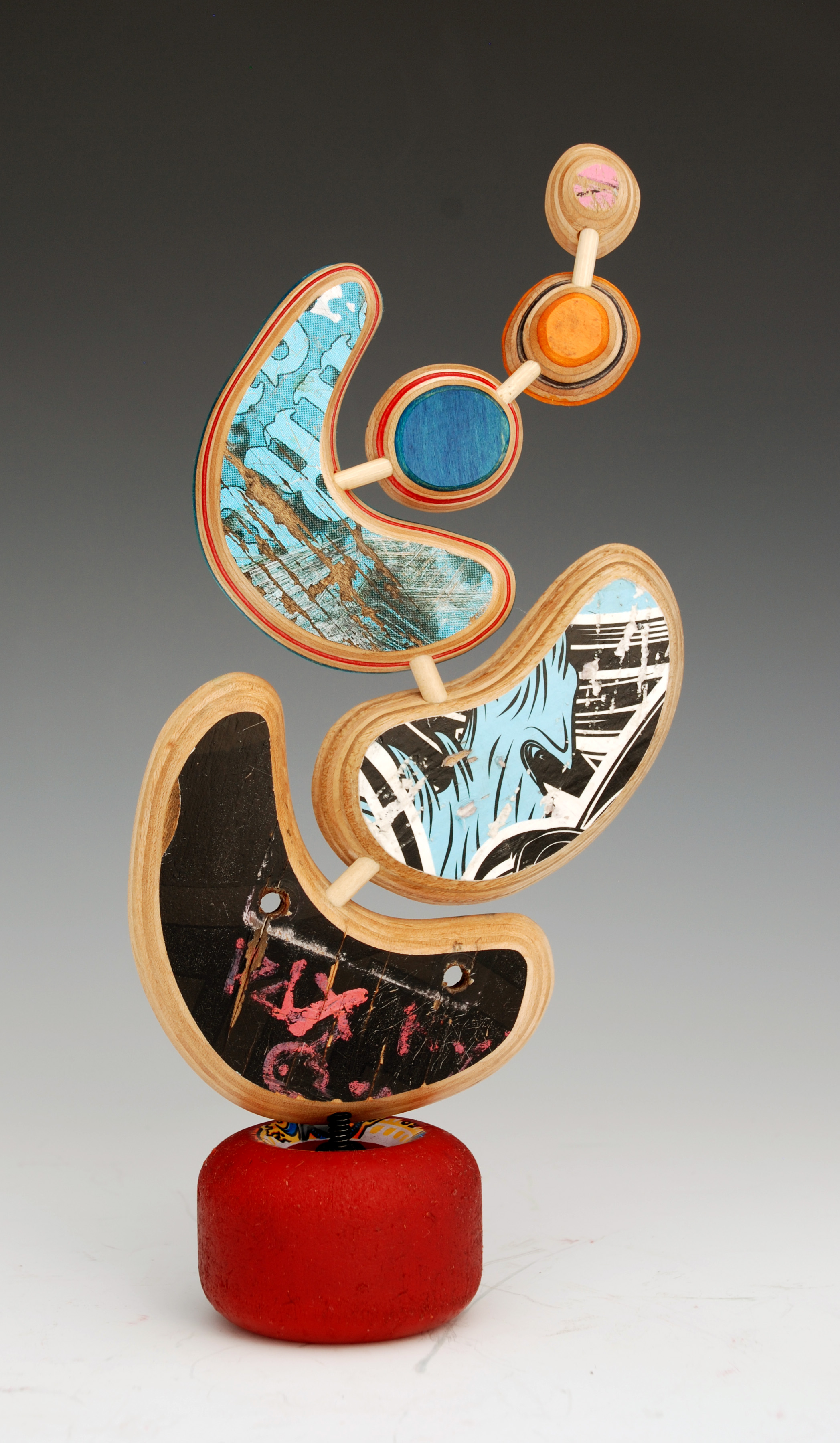 I have loved the simplicity of working with only one material (well there are some dowels and wire), just delving as to possibilities, learning to work with the curving nature of the decks always focused on the distressed graphics.