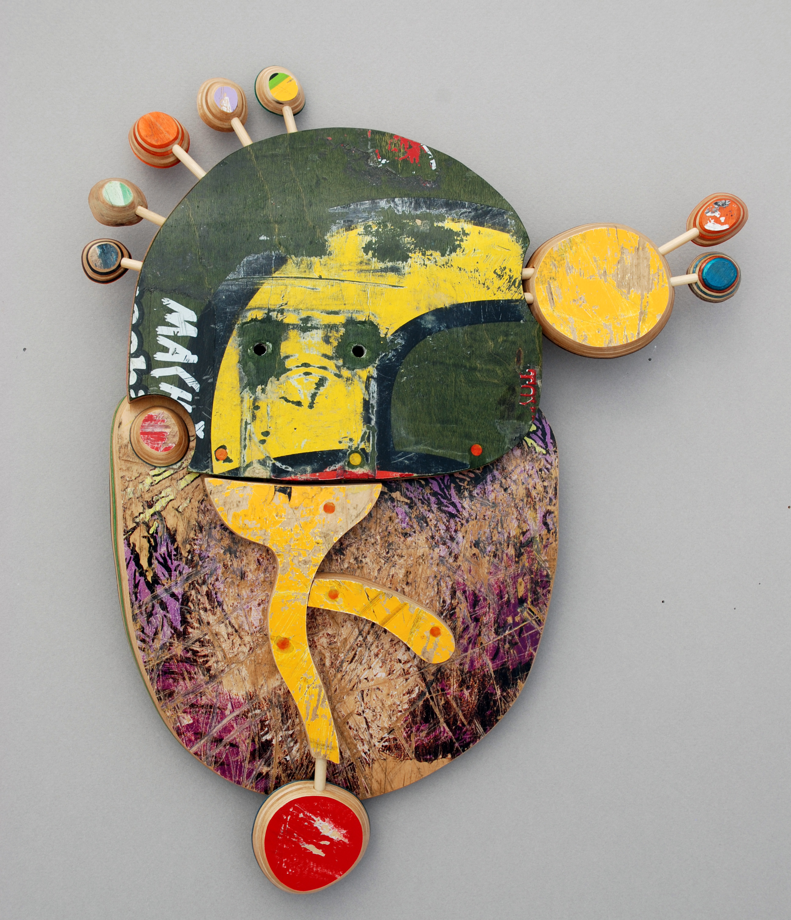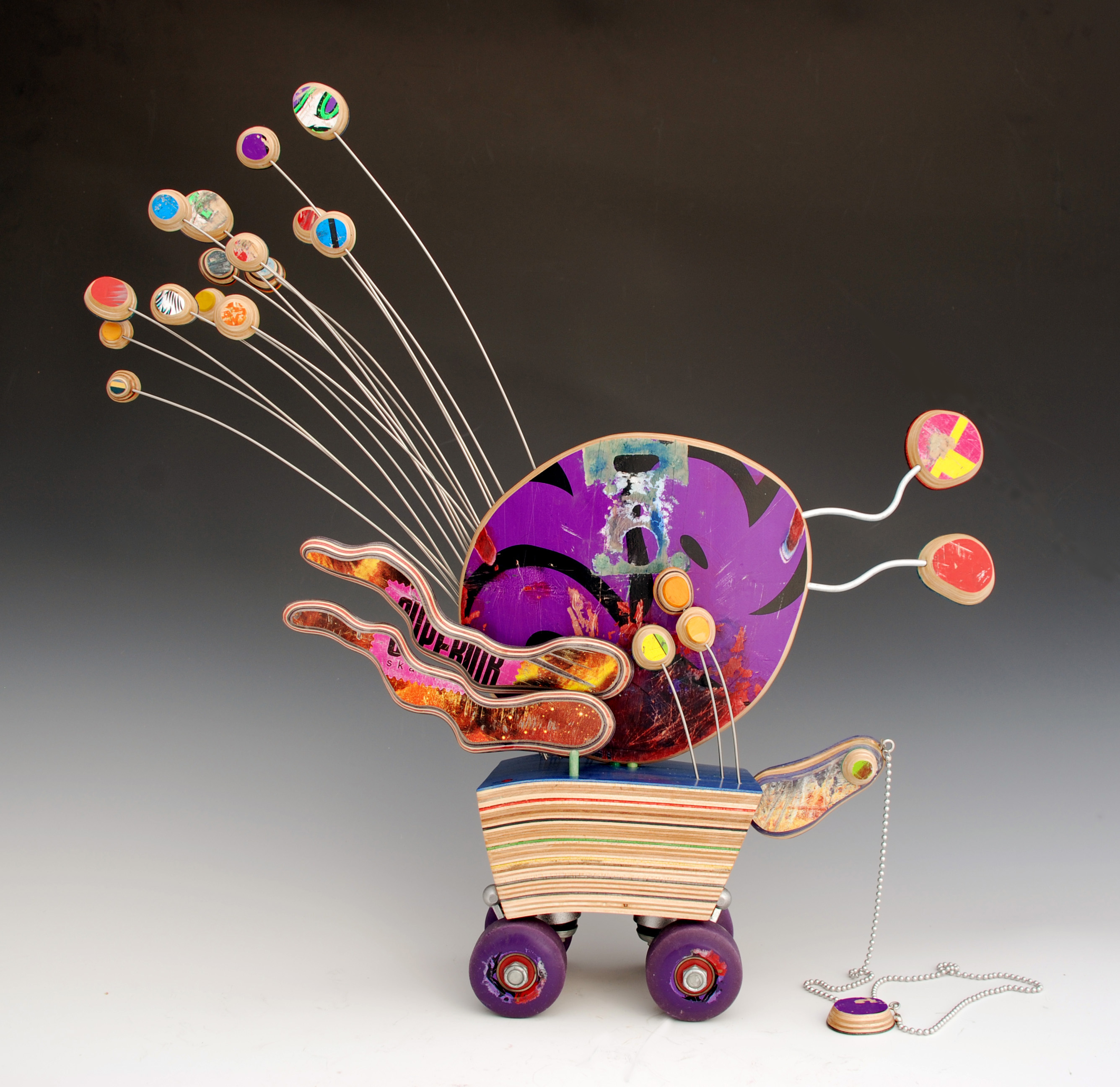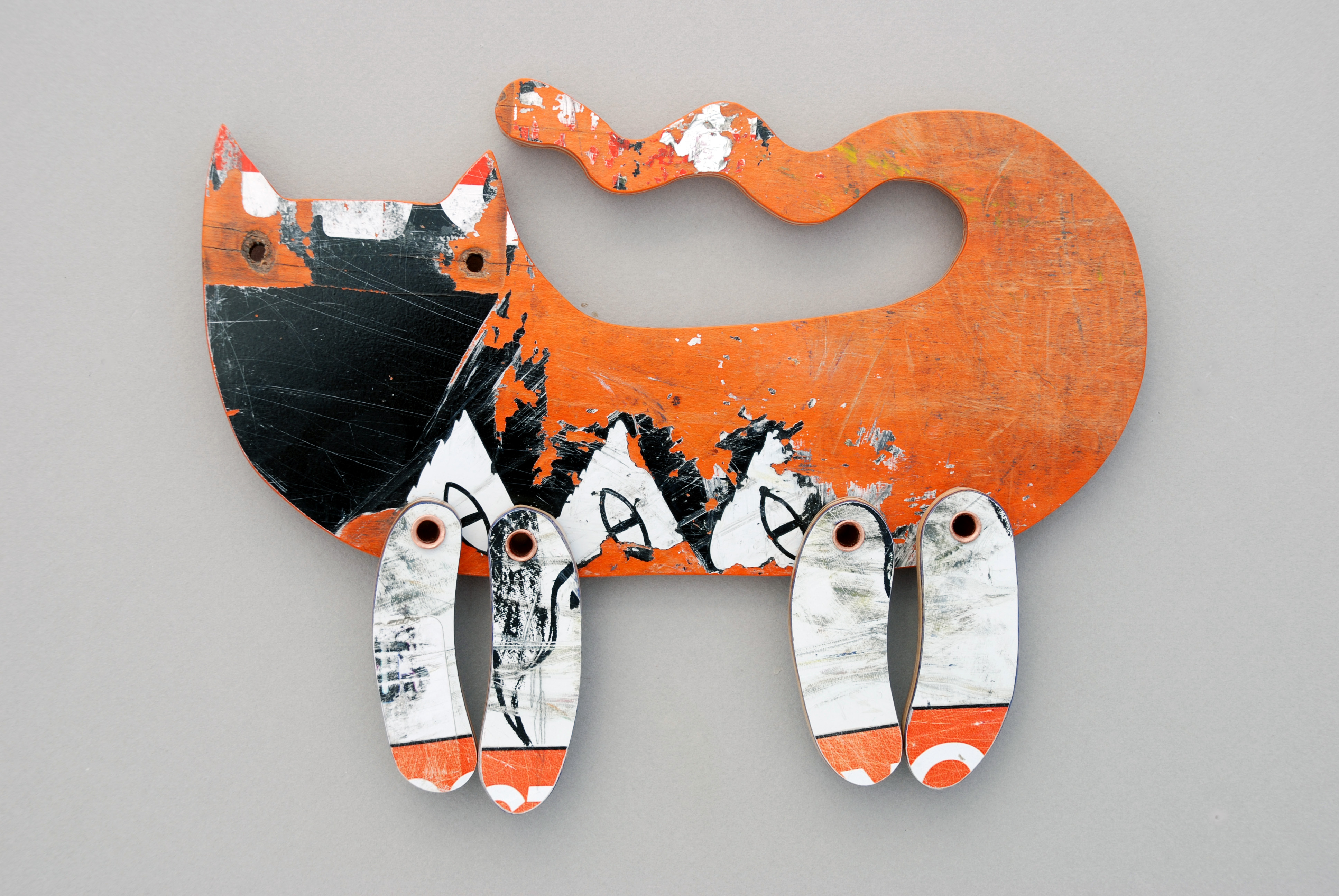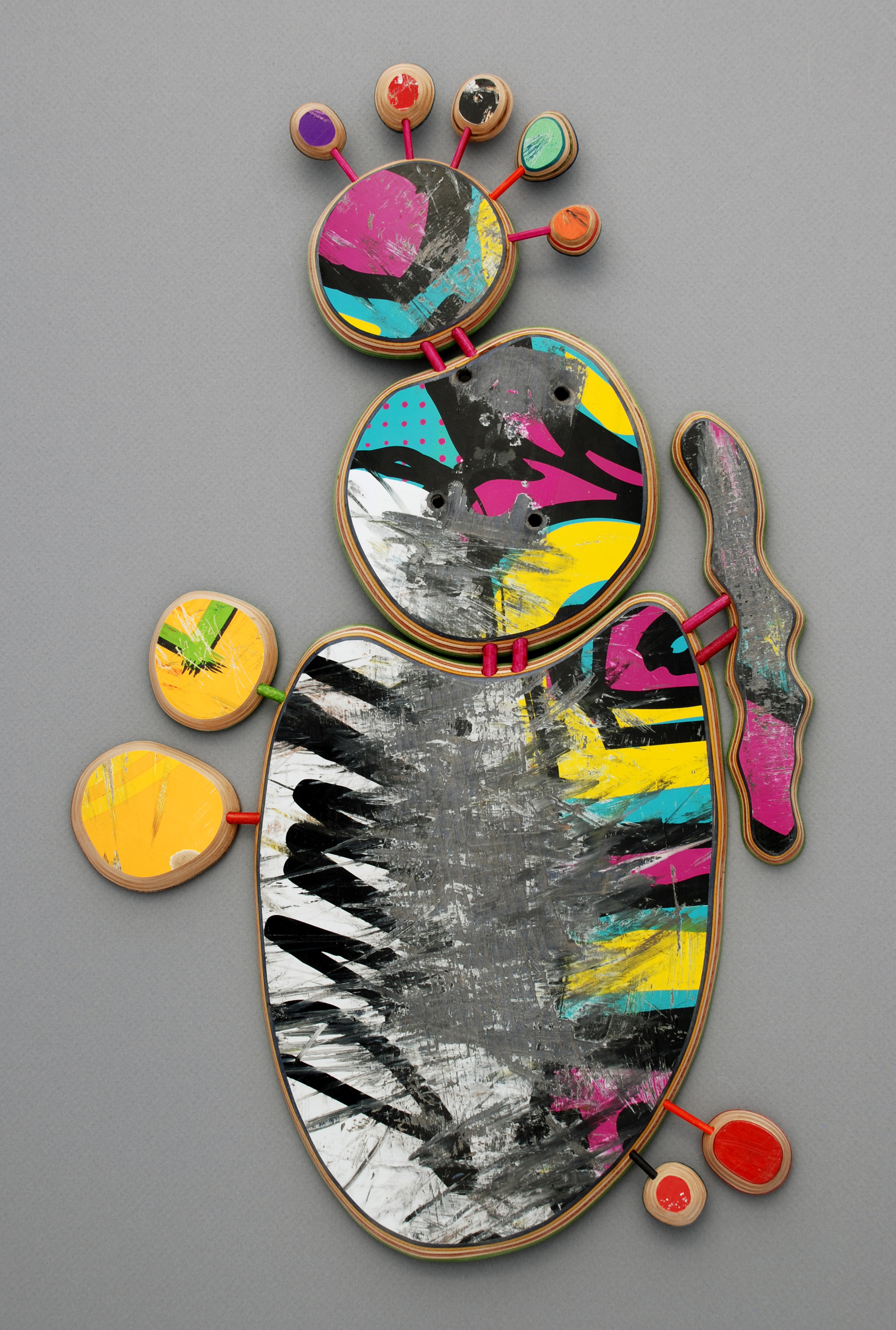I have loved the simplicity of working with only one material (well there are some dowels and wire), just delving as to possibilities, learning to work with the curving nature of the decks always focused on the distressed graphics.
