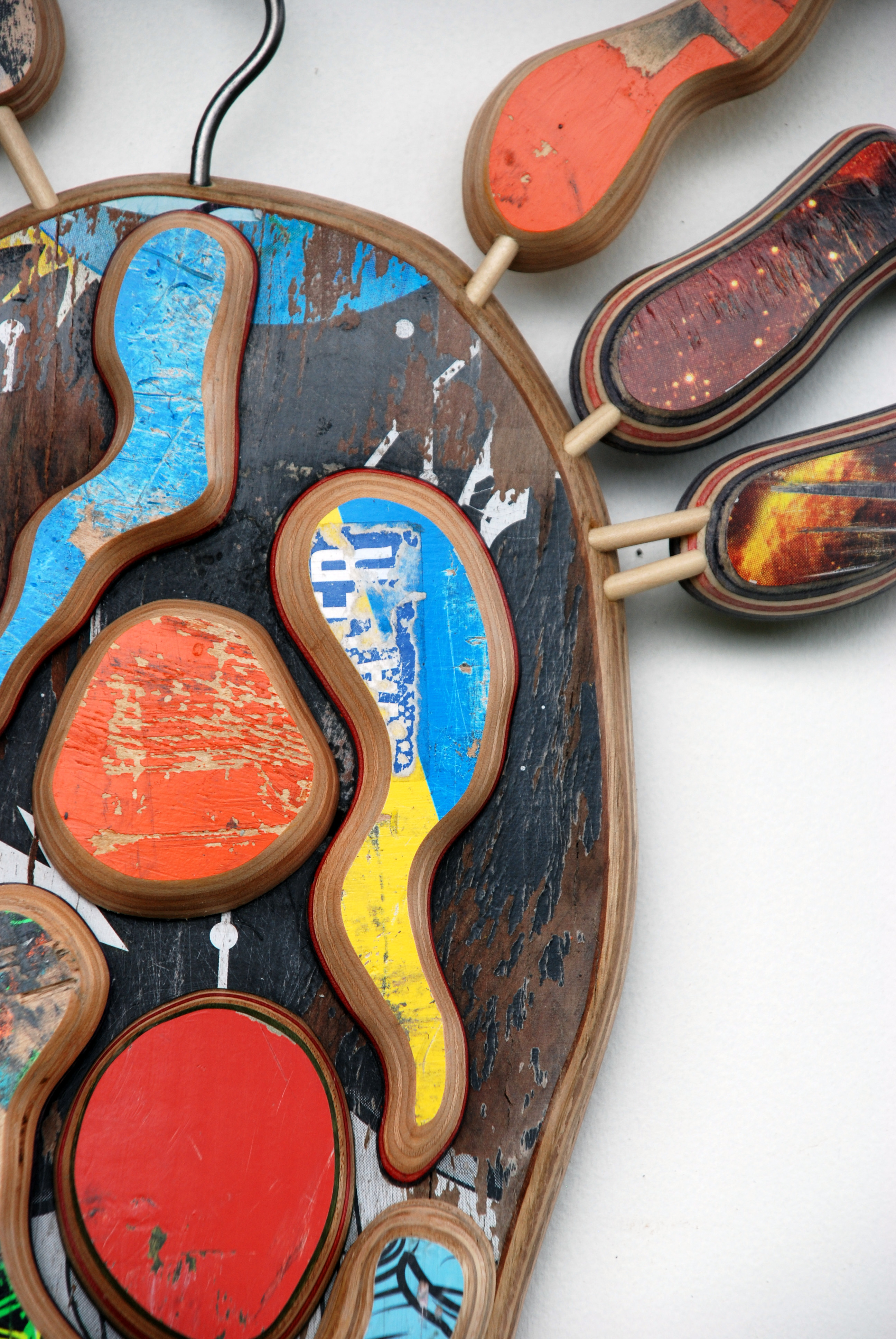 Here they are, my explorations into the possibilities of recycled skate boards. I gleaned them from skate shops mostly, adhering to my motto of making something from nothing. I’ve added a few more woodworking tools to my arsenal the best being a tiny belt sander which I altered a bit to work for me.